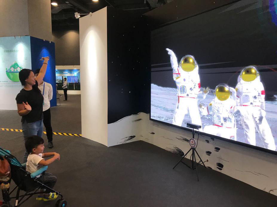 “我们登到月球上来了,你认识我吗?”在航天科普互动体验墙,观众看到自己穿上“宇宙服”在月球上行走的样子,高兴地直招手;小孩子们更是穿着“宇宙服”兴奋的跑、跳,像是在月球上追逐着“天宫”与”火星”……