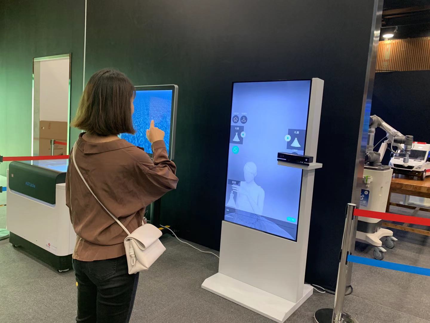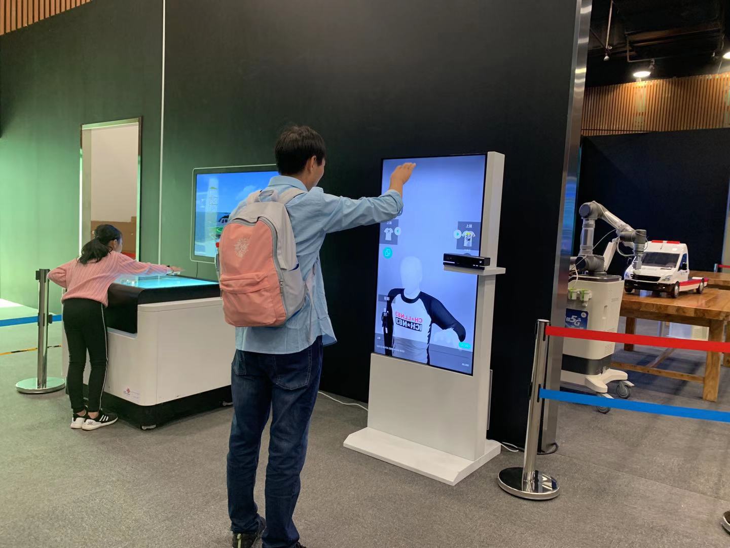 “这是一款可移动的5G+AR试衣镜,只需能过手势操作便可实现AR场下的虚拟‘试衣’。”现场工作人员表示,该AR试衣镜通过红外深度摄像头识别试衣人员的人体姿态,进行3D建模,还原真实人体形态,并通过5G网络连接云端的服饰模型数据库,购买人员站在试衣镜前,就可以快速试穿各色最新服饰。