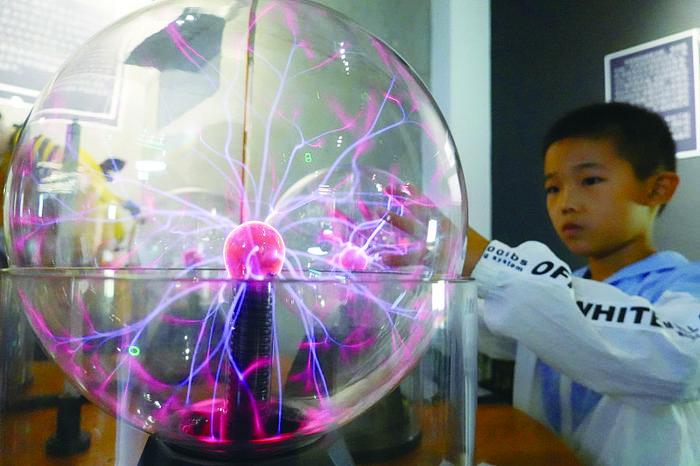 图为在山东青岛海信科学探索中心,小朋友体验“等离子管”科普互动项目。