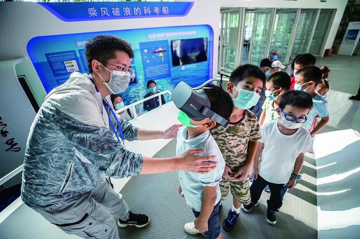 图为在北京中国科技馆内,小朋友们正通过VR眼镜跟随科考船探索科学奥秘。