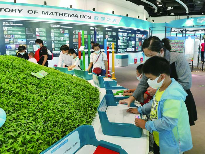 图为在北京科学中心,孩子们通过各种有递进关系的游戏感受数学的乐趣,和数学在生活中的应用。