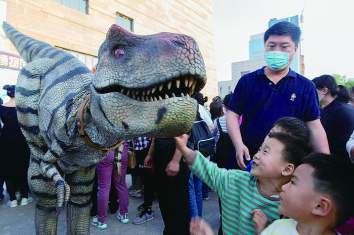 图为在宁夏银川地质博物馆,孩子们与工作人员扮演的“恐龙”互动。