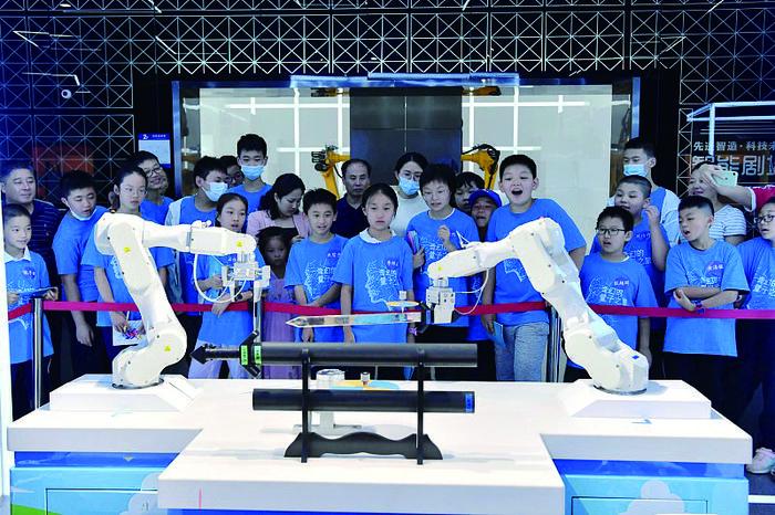 图为在在安徽合肥创新馆,小朋友在参观体验创新展品及模型。