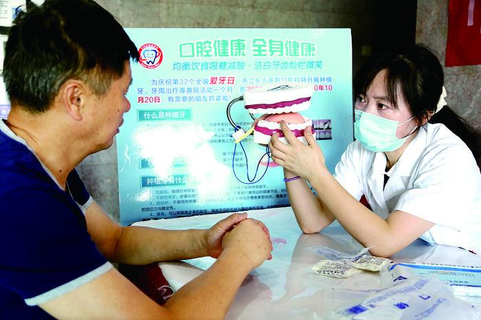 图为在江苏连云港市核电专家村宿舍区,医生现场为核电专家村的居民讲解牙齿保健科普知识。