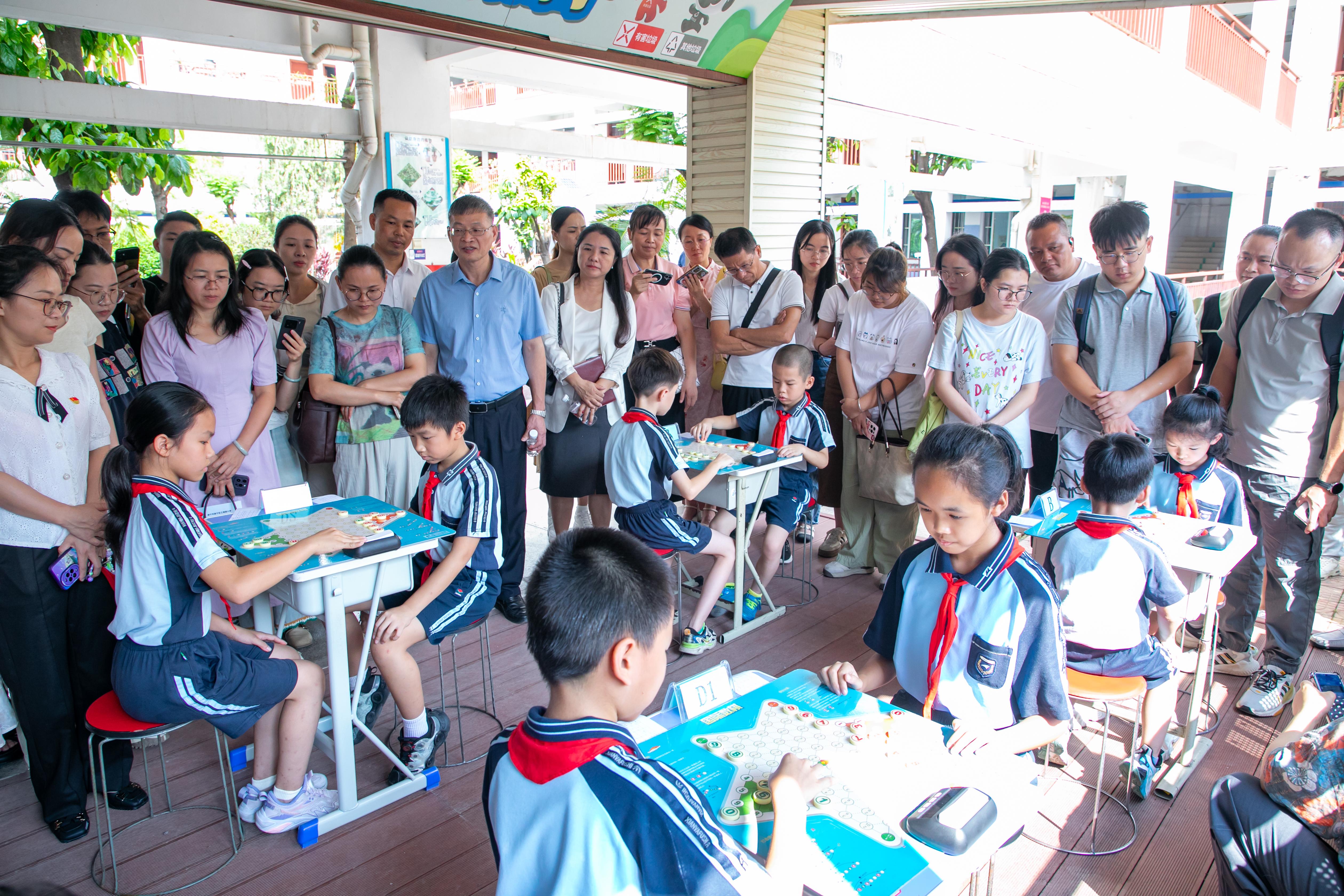科技辅导员们在南宁市鑫利华小学观摩青少年国际数棋技能现场展示。