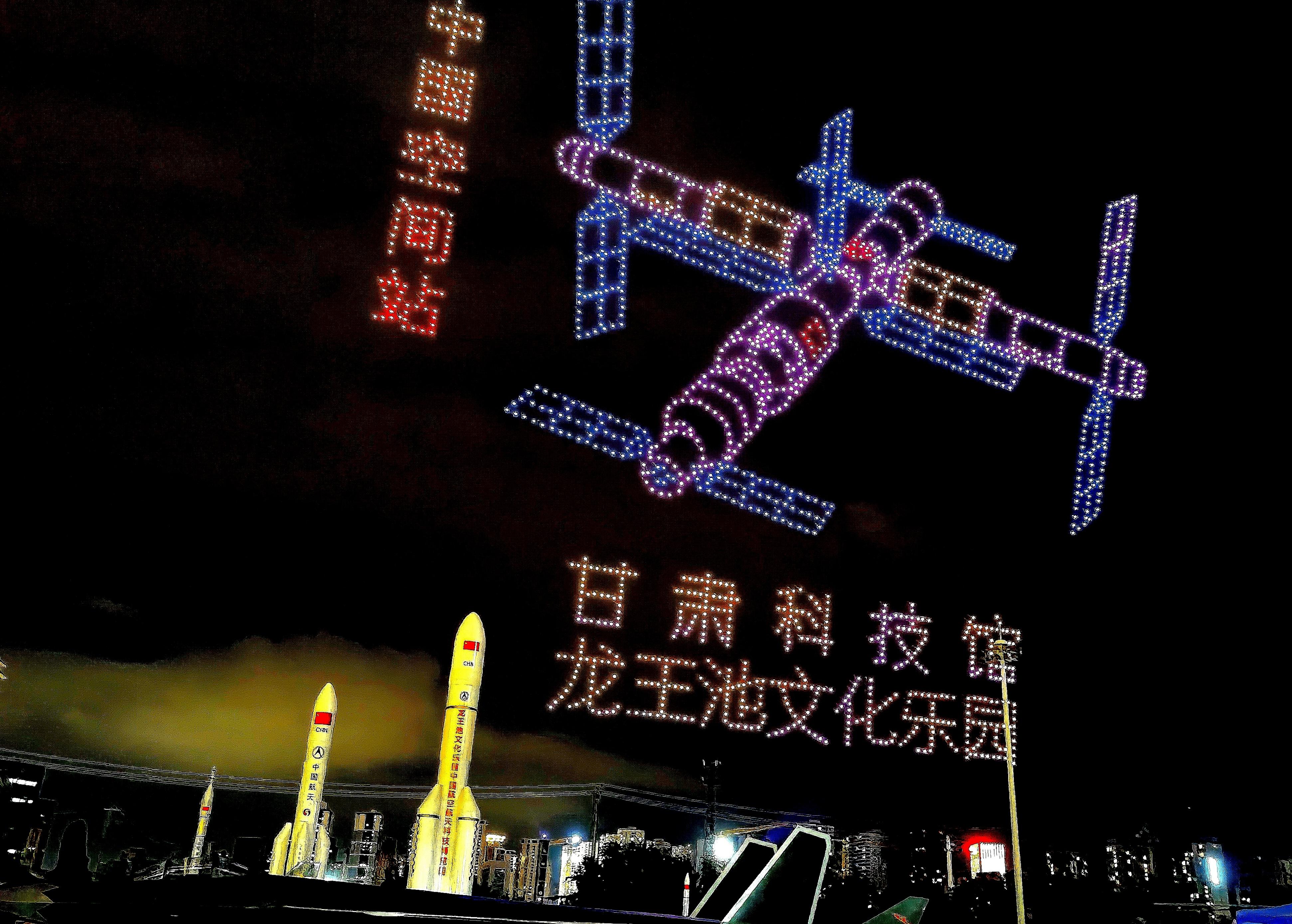 无人机编队变幻出中国空间站“天宫”巡游寰宇的震撼场面。