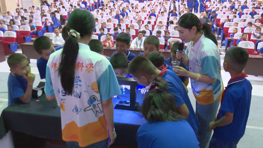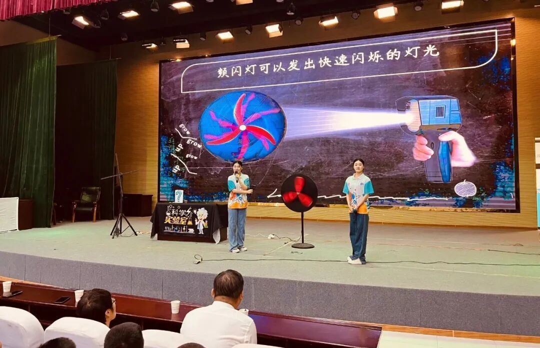 在光学实验区,1600多个小灯泡随旋转的多叶电风扇有序亮灭,分散的光点汇聚成轮廓分明的立体地球模型,还变换出“爱科学 学科学”“探索未知”等字样,工作人员同步讲解视觉暂留原理;声学实验区,不同大小、长短的竹笛奏响清脆与低沉的旋律,同学们踊跃上台,在指导下尝试吹奏,即便音调断断续续,也格外认真。