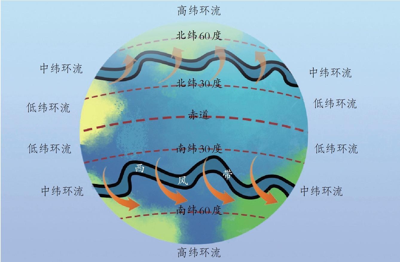在赤道上空,空气受热上升并向极地方向流动,于南纬30度左右开始下沉,形成副热带高压带。随后,空气从高压带向副极地低压带流动,在地转偏向力的作用下形成了近乎恒定的西风。