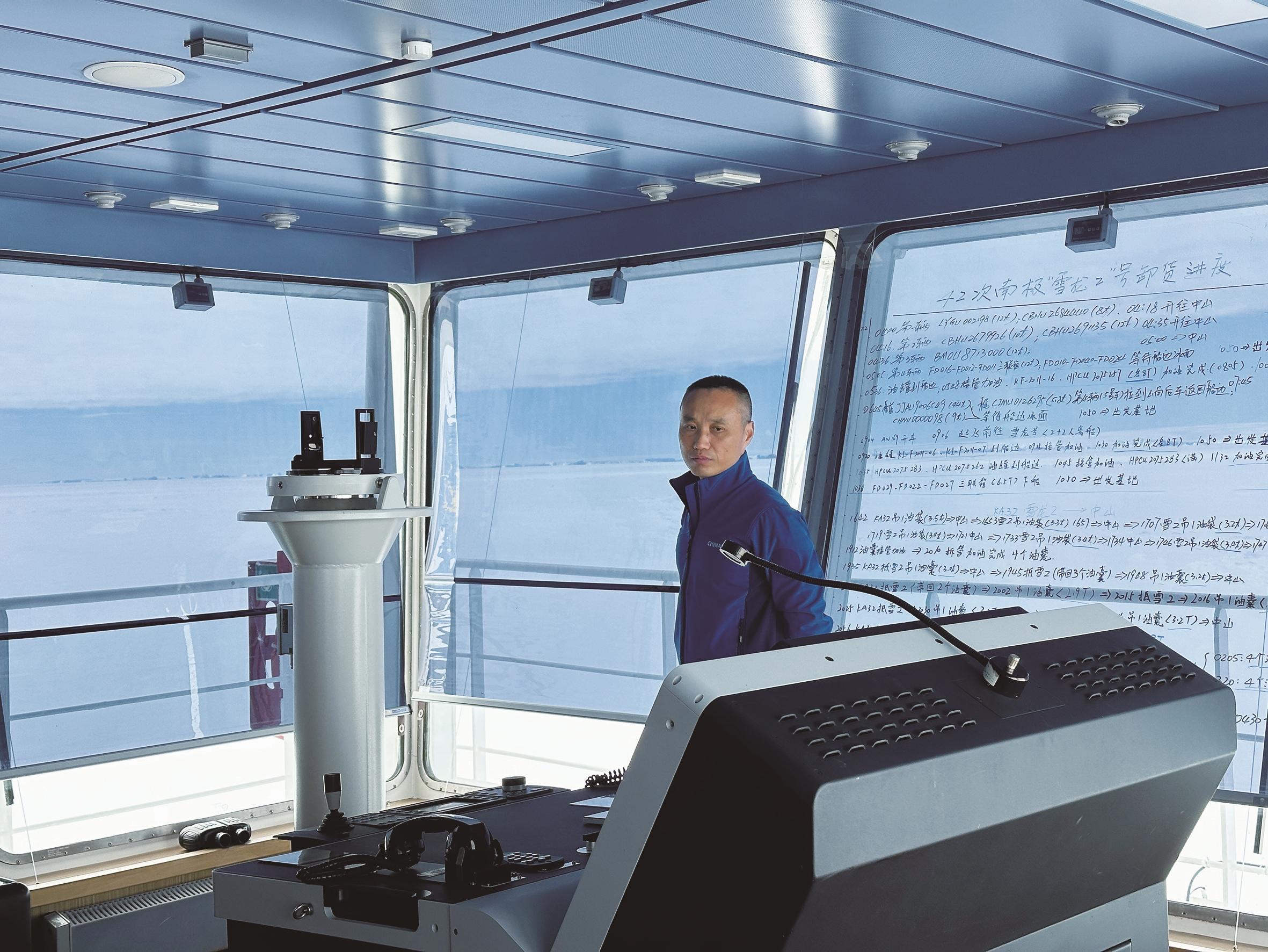 复杂的冰情让大家犯了难,最艰难的时候4个小时才前进1海里(约1.852千米)。“百分之三十倒车”“百分之四十倒车”“左舵十五度”“回正”,再微调,慢慢加车,前进冲撞破冰,循环往复。“雪龙2”号三副赵晶频繁往返于驾驶台和船艉观察位置,根据冰情指导水手操控“油门”。“雪龙2”号二副杨凯介绍,一般情况下,“雪龙2”号采用船艏连续破冰方式,只需要将船速控制在一定范围,1.5米以内的海冰自然而然被破开。当冰情复杂时就要考虑冲撞破冰,将船体倒退几百米后,根据冰的缝隙进行微调再向前冲,利用船体重力把冰压碎。