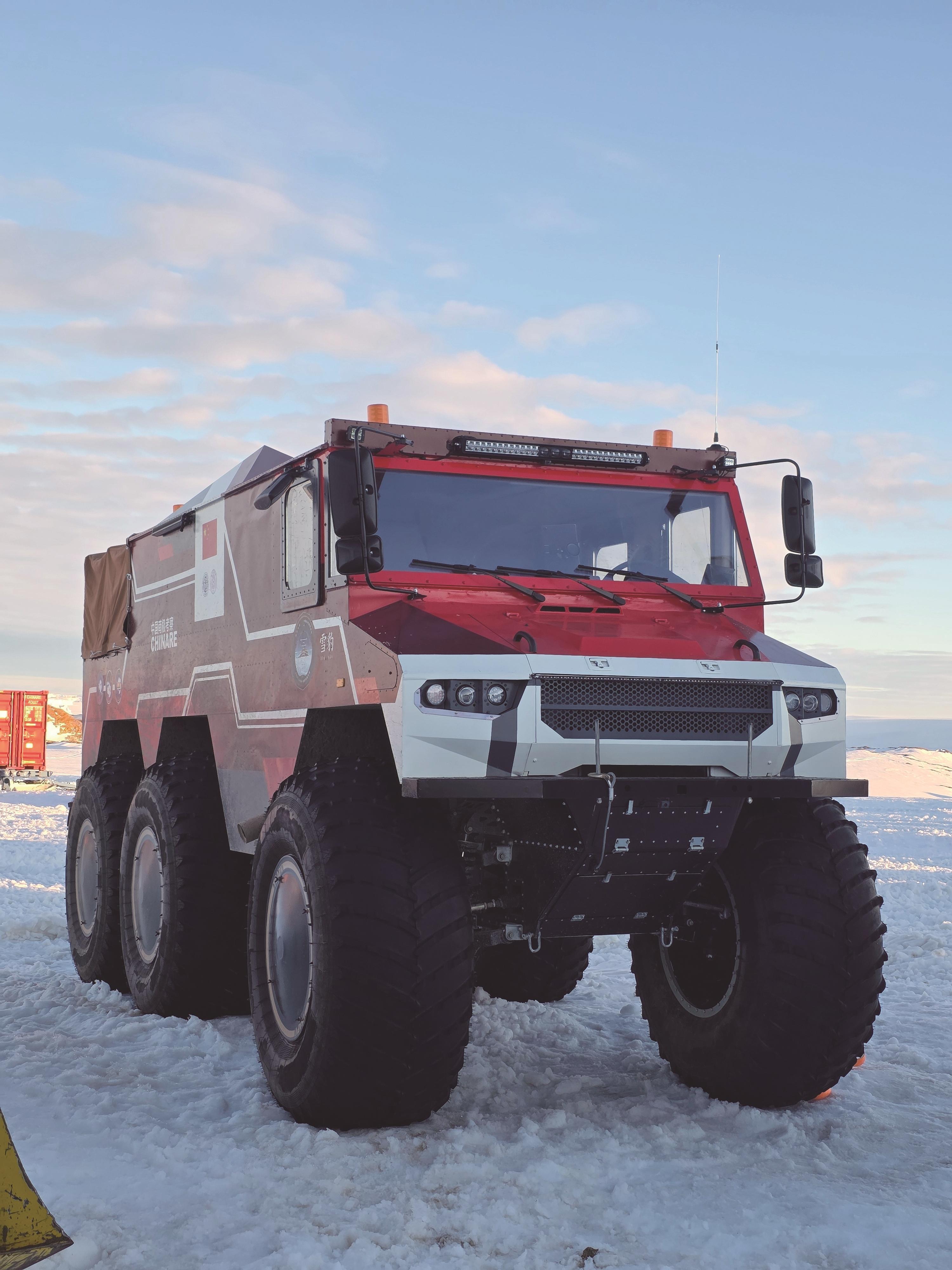此次卸货的“重头戏”,当属一批代表中国极地装备自主化水平的科研设备,其中最引人注目的是“雪豹”6×6轮式(试验)载具。这是由我国自主设计研制的,面向极地内陆复杂地形场景的高机动轮式特种平台。