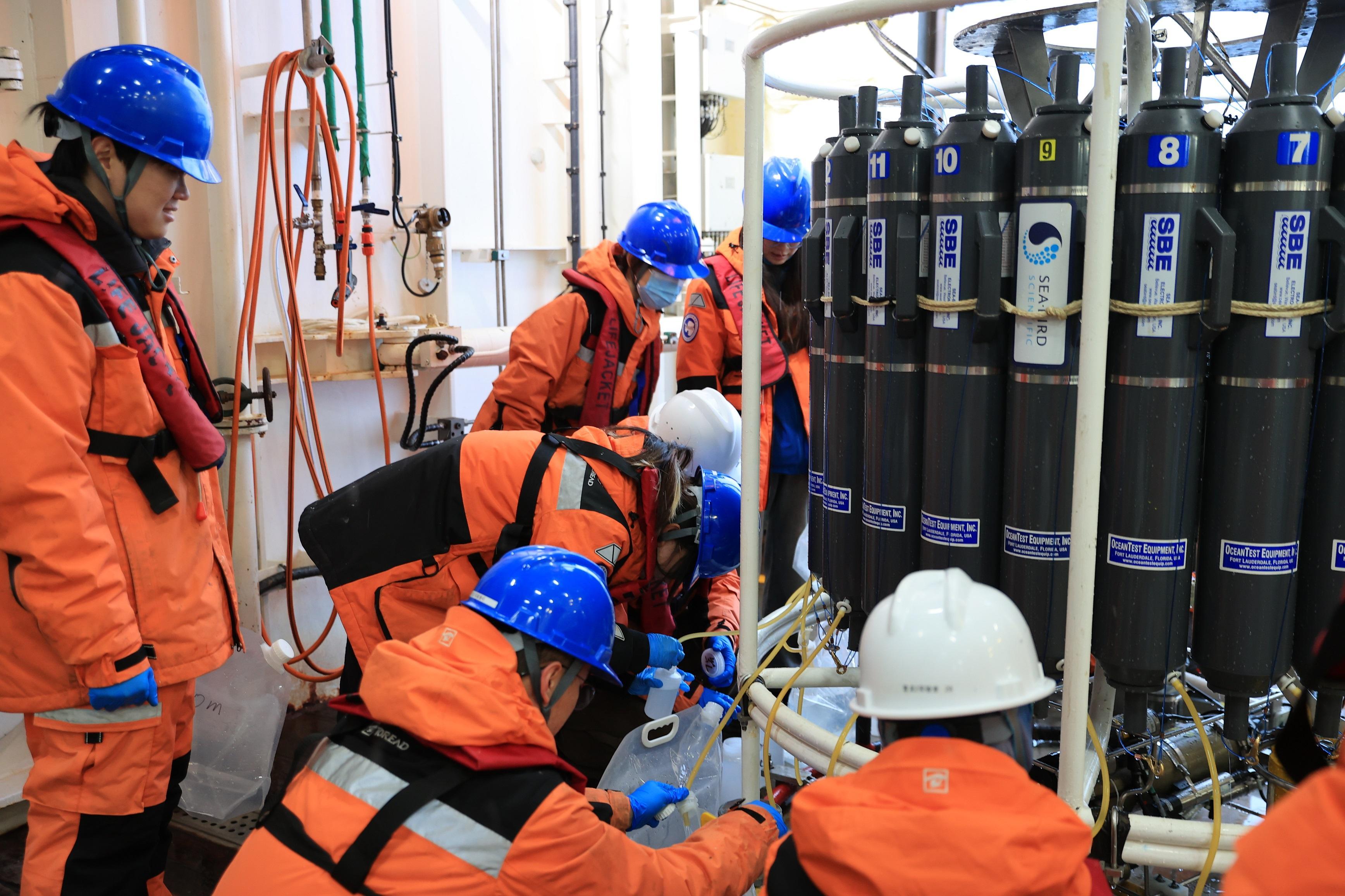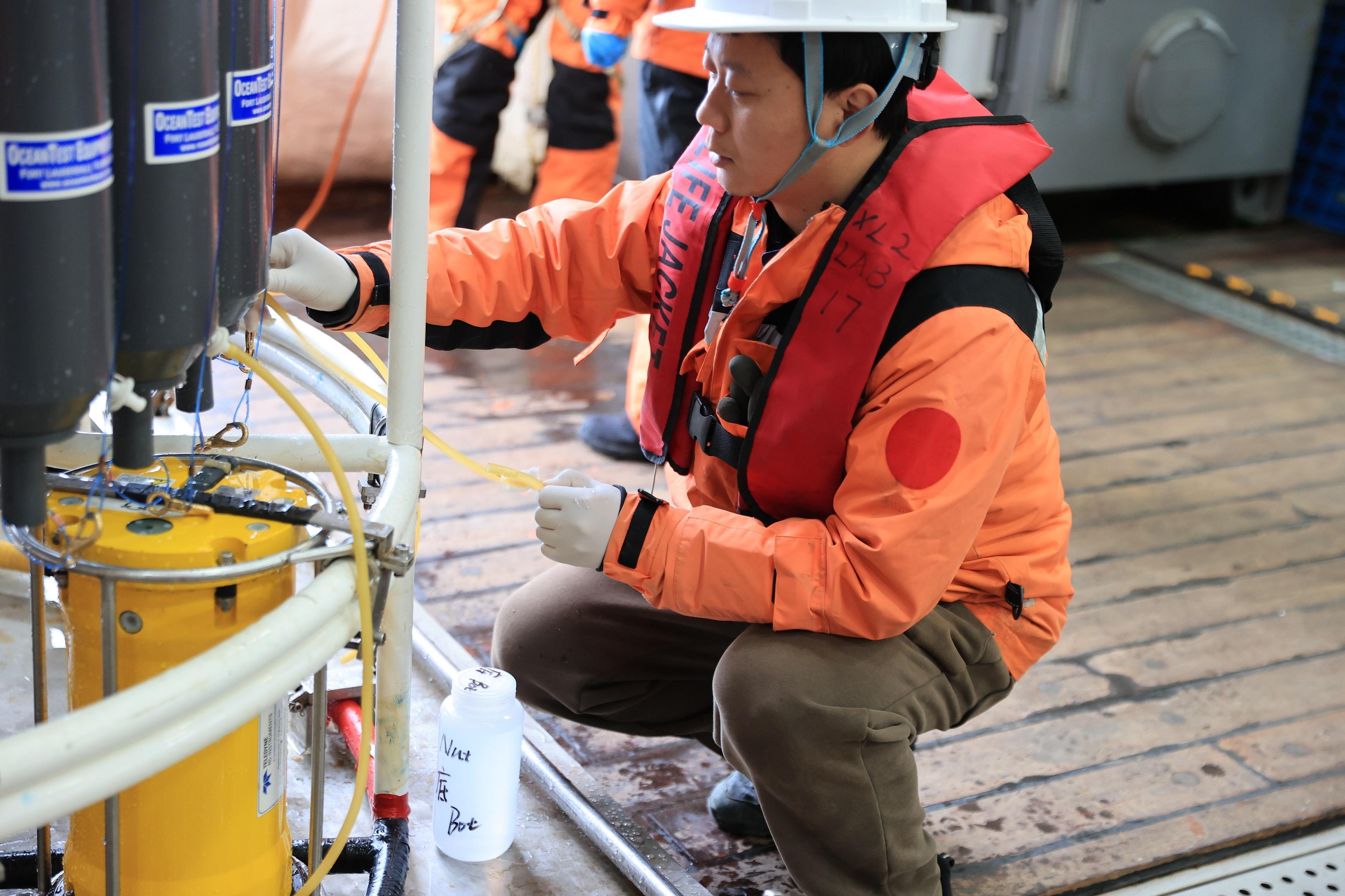 “我们要分析海水中的溶解氧、营养盐、溶解有机碳等15项关键海洋化学参数。”分析化学组组长、自然资源部第二海洋研究所助理研究员朱长凤一边取水,一边向记者作介绍。