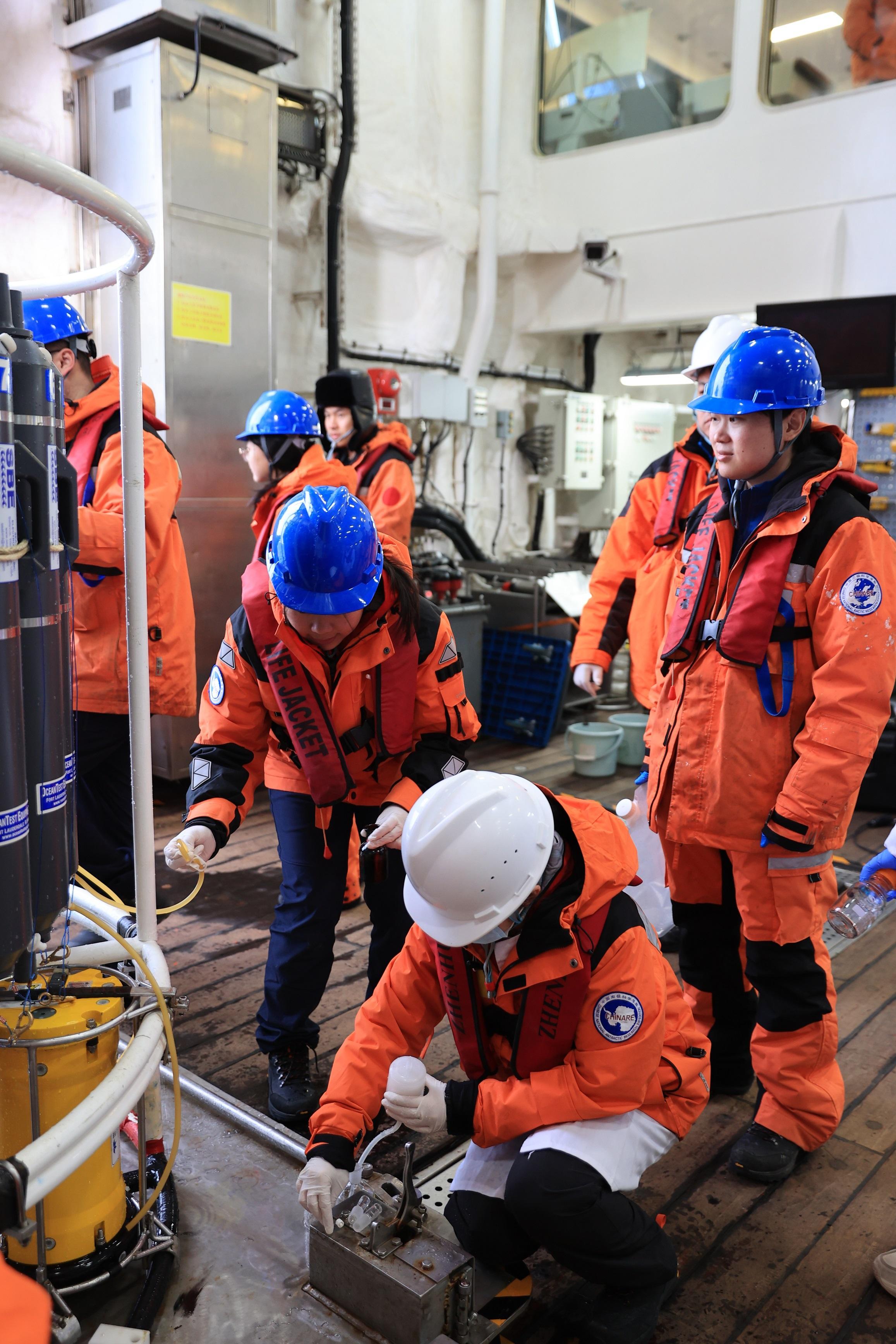 已经参加过3次南极考察的朱长凤,本次考察中负责溶解有机碳和颗粒有机碳的采样。尽管晕船的不适始终相伴,但每到一个站位,他都精神抖擞地出现在CTD面前,认真完成采样任务。“溶解有机碳和颗粒有机碳是海洋碳循环的核心载体,是反映海洋碳汇能力的重要指标。”朱长凤说,南大洋碳汇强度的变化与全球温室气体浓度息息相关。