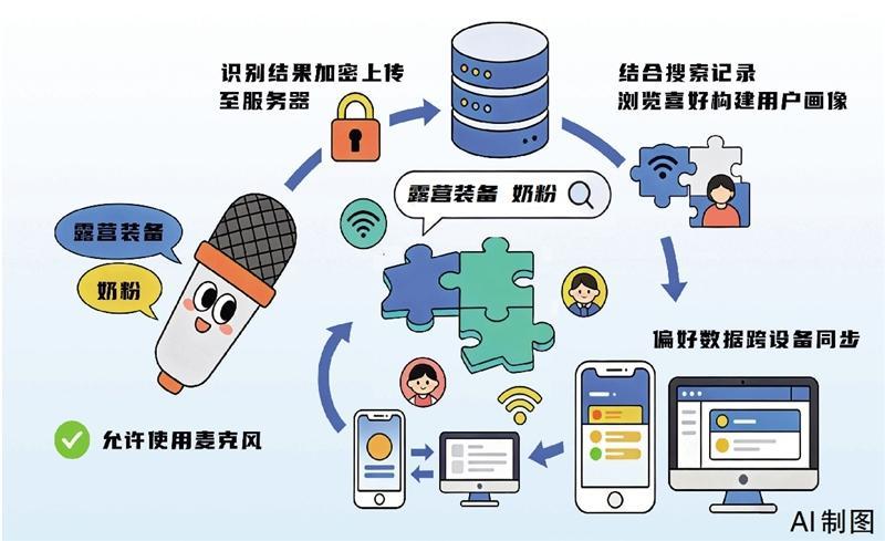 “从技术层面来看,正规平台通常不会采用成本高且违法的全程监听方式,而是依赖用户授权后的‘本地关键词触发+多源数据融合’机制运作。”陈晋鹏解释,简单来说,当用户允许APP使用麦克风后,设备会在本地识别环境声音中的关键词,如“露营装备”“奶粉”等,随后将识别结果加密上传至服务器。平台再结合用户的搜索记录、浏览喜好,甚至同一Wi-Fi下其他设备的数据、社交好友的兴趣标签,多维度构建精准的用户画像。