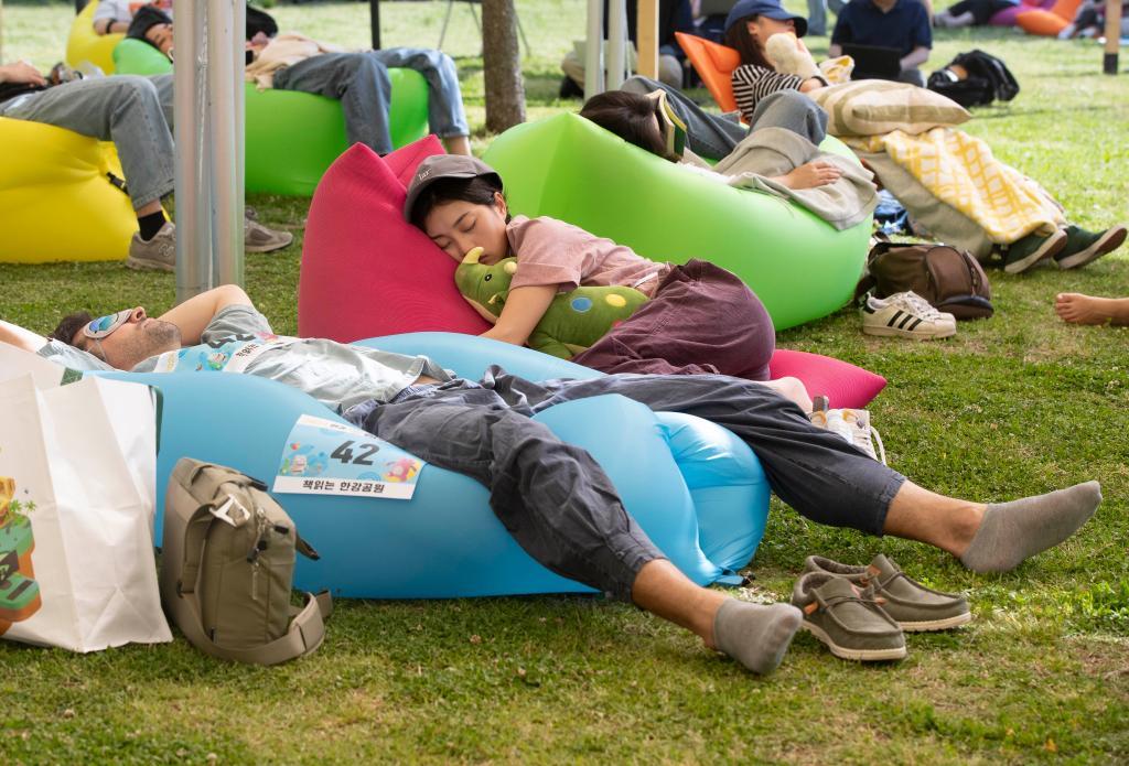 韩国汉江公园举行“汉江睡觉大赛”。新华社记者 姚琪琳 摄