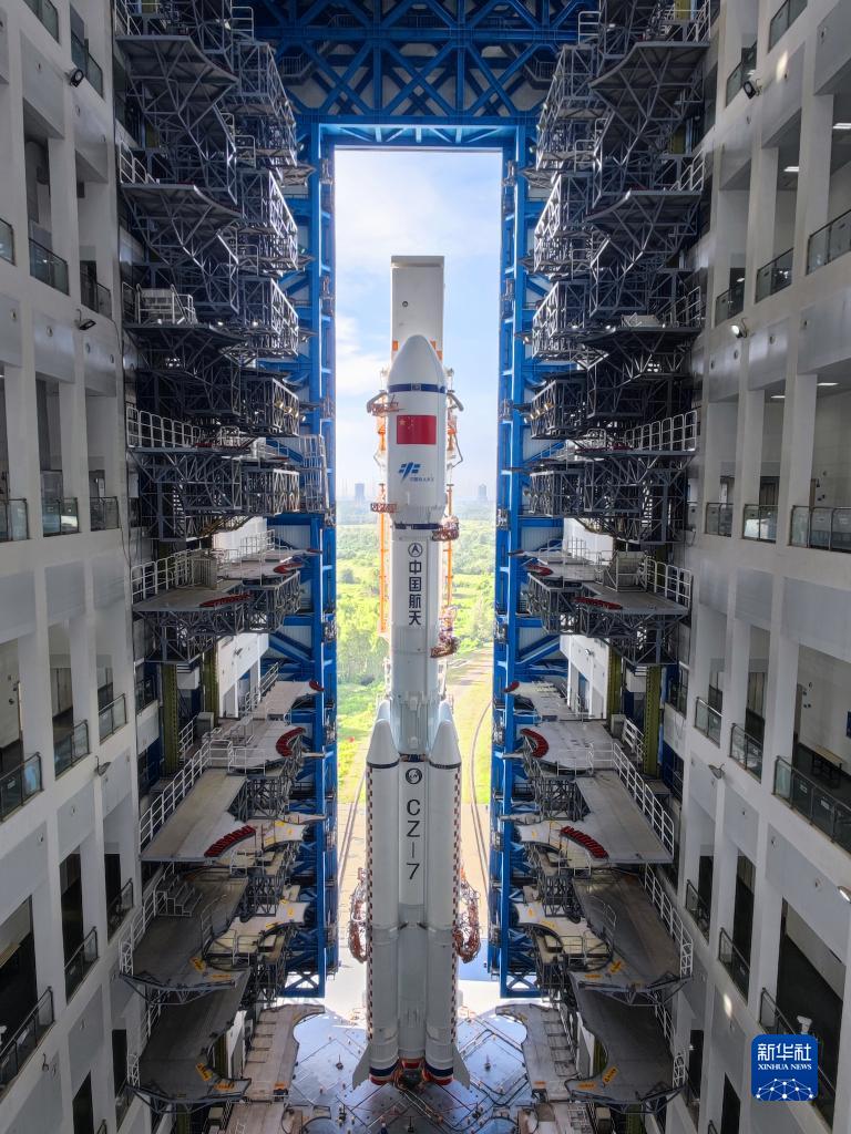 9月16日,天舟三号货运飞船与长征七号遥四运载火箭组合体在测试厂房等待转运。新华社发(胡煦劼 摄)