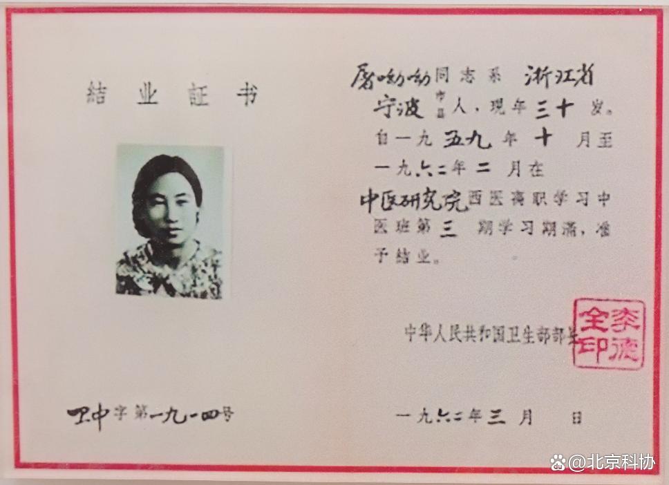 屠呦呦西医学习中医班结业证书