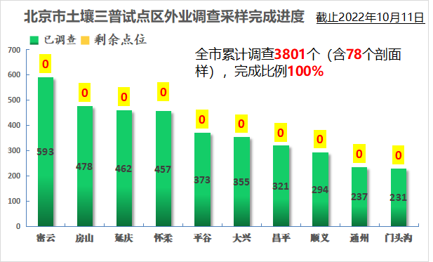 截至10月11日,北京市全面完成国家下发的3801个调查样点,包括3723个表层样点和78个剖面样点,外业进度在全国31个省(区、市)、3个计划单列市、新疆生产建设兵团、北大荒农垦集团中,排名居于前列。今年北京市有10个区参加全国土壤普查试点,试点区数量居全国之最。