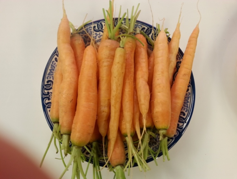 胡萝卜采收期不严格,可根据品种特性和市场需要,综合考虑产量、单价等因素,灵活调整采收标准。过早采收,水分含量高,肉质根未充分长大,单产低,品质差,价格较高,适合直接销售;采收过晚,成熟度过高,中心柱粗,质地劣,耐贮性差,不适宜贮藏。当市场供应量不足时,可适当早采,既能保证市场供应,又能提早获得收益,同时也能避免集中上市出现销售慢、价格低等问题;采收过晚,胡萝卜品质降低;用于贮藏的胡萝卜达到采收标准后,应及时采收。采收时留2-3cm叶柄,利于胡萝卜保持商品性。