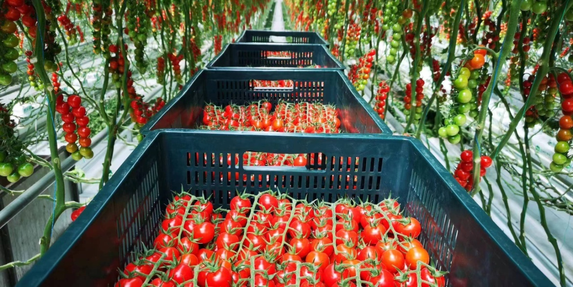 往地面看,这些番茄秧根植于长方条状的椰糠“土壤”中,顺着牵引绳固定向上生长。温室内随处可见密密麻麻的管线和传感器,它们精准控制着番茄生长的温度、湿度、通风、光照等环境条件,以及植株生长所需的水肥滴灌。这些科技手段的集成应用,使得番茄一年的生长期长达10个月,产量达到700吨,是普通大棚番茄产量的3倍以上。这些现代化的科技手段让在场的市民们频频点赞。