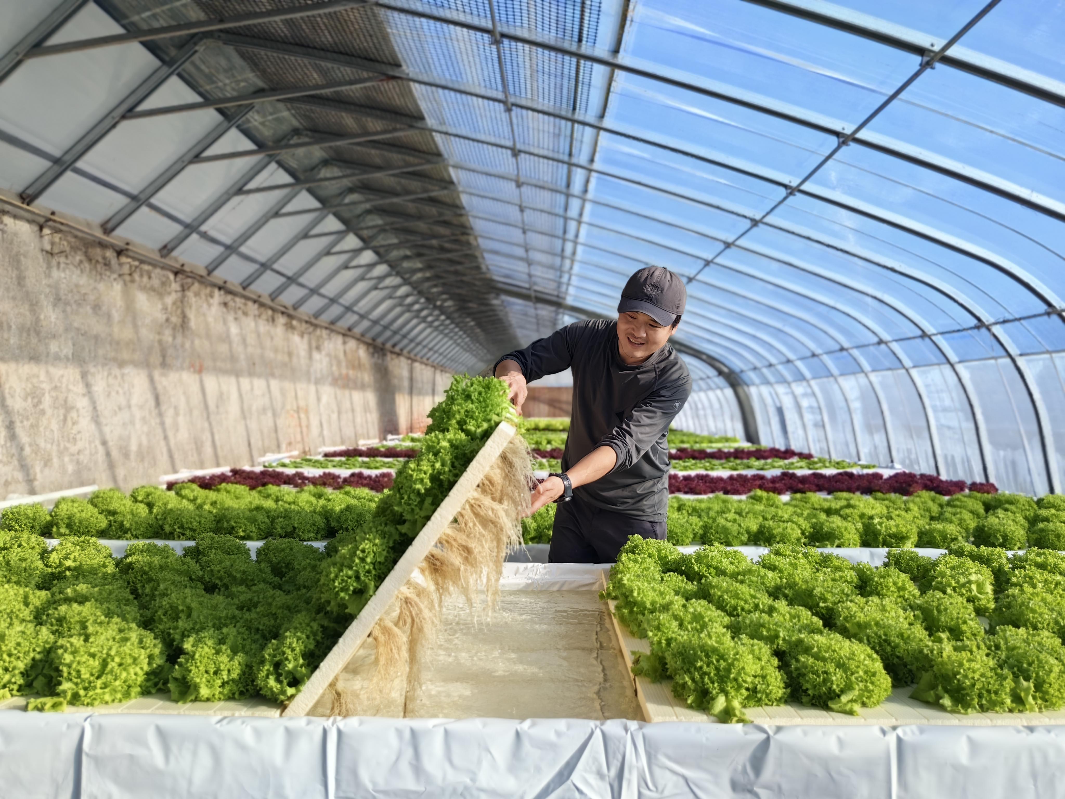 在“渔阳郡·桃花源农场”的水培基地,蔬菜长势喜人,水肥一体化系统正为水培生菜精准“投喂”——这正是改造提升的立体水培设施,它实现了蔬菜的自动化、工业化生产。“现在几个棚的水培蔬菜都可以由一人管理。”农场主理人杜连辉自豪地介绍。作为来村创业的新农人之一,他体验到农业科技带来的实在变化,也希望把农业科技的成果从乡村带到城市里去。“我们创立了品牌,开发了阳台农业产品,让都市年轻人在家就能水培蔬菜,体验‘蔬菜自由’的乐趣。”