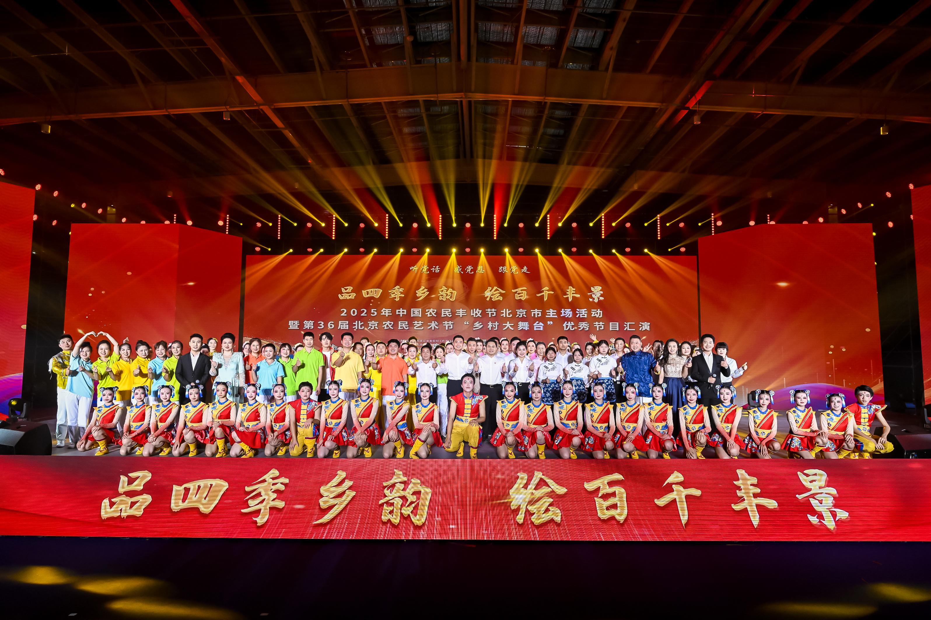 同时,以“品四季乡韵 绘百千丰景”为主题的第36届北京农民艺术节“乡村大舞台”优秀节目汇演在会展中心精彩上演。本届汇演汇聚了来自全市各涉农区精心创编的10个优秀节目,充分展现首都农民群众风貌、展示京郊乡村文化。其中,《喜庆丰收》以“丰收狂欢”为核,门头沟区军庄大鼓擂响开场节奏;情景快板《逛北京优农市集》以自媒体主播王小微直播为主线,展现更新鲜、更优质、更安心的北京农业新场景;情景剧《红福路》讲述老党员于洪福历时21年打造一条惠民路的感人故事,彰显其“执着坚韧重实干,敢想敢为勇担当”的精神;音诗画《我为北京乡村代言》邀请驻村第一书记、新农人等代表登台,现场分享他们在产业、科技等方面的新风貌与创新成果。汇演节目与丰收节主场活动以文化为纽带,共同庆祝丰收、礼赞丰收、共享丰收,用艺术传递振兴梦想,营造热烈浓厚的丰收喜悦氛围。