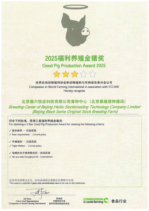 近日,2025动物福利与可持续农食大会在北京平谷金海湖国际会展中心开幕,吸引了来自20余个国家和地区的700余位专家、学者和企业代表。会上,北京特色畜禽遗传资源北京黑猪保种单位——北京黑六牧业科技有限公司育种中心(北京黑猪原种猪场)被世界农场动物福利协会和动物福利与可持续农食分会认可,授予三星“福利养殖金猪奖”。该奖被公认为全球生猪养殖领域动物福利的最高标准之一,这是北京特色畜禽遗传资源在动物福利养殖领域又一次被国际认可。