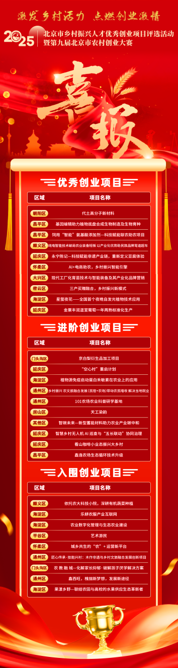 会议发布了2025年北京市乡村振兴人才优秀创业项目评选活动暨第九届北京市农村创业大赛优秀创业项目奖10个,进阶创业项目奖10个,入围创业项目奖9个;颁发大赛“最佳人气奖”1个,大赛“优秀组织奖”3个;颁发“首都乡村振兴青年先锋奖”10个,“首都乡村振兴巾帼创业先锋奖”11个。对优秀创业项目、进阶创业项目和入围创业项目分别给予奖励资金支持。