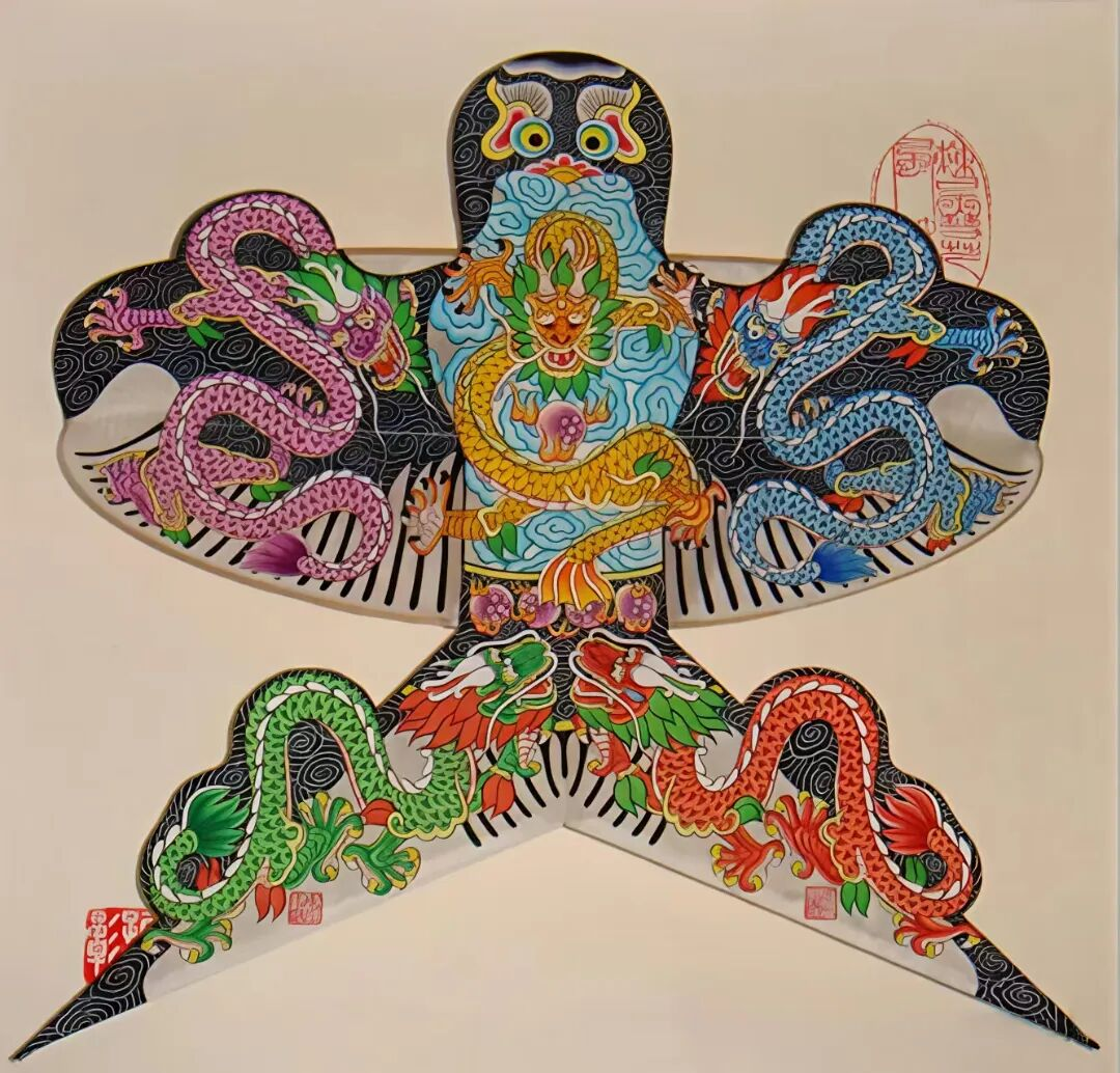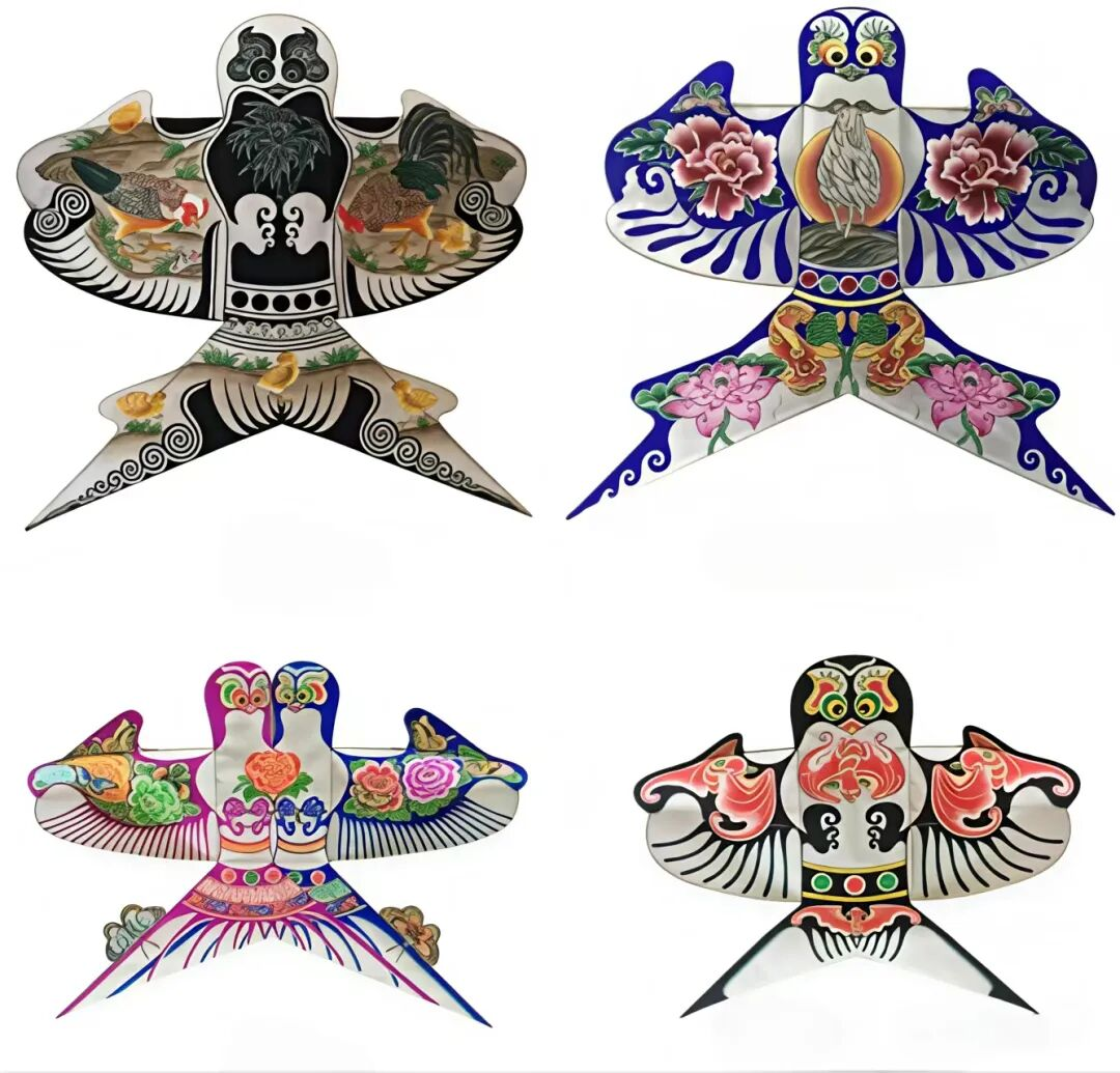 “绘画”则是曹氏风筝的灵魂,每一笔都藏着东方美学的密码。与普通风筝的简单图案不同,曹氏风筝的绘画融合了工笔、写意、剪纸等多种艺术形式,题材更是涵盖了花鸟、瑞兽、神话,每一种图案都有吉祥寓意:“肥燕”象征多子多福,翅上绘着“百子图”;“瘦燕”代表轻盈灵动,尾羽缀着“四季花卉”;“龙睛鱼”则寓意年年有余,鱼鳞用金色颜料层层罩染,在阳光下宛如波光粼粼。