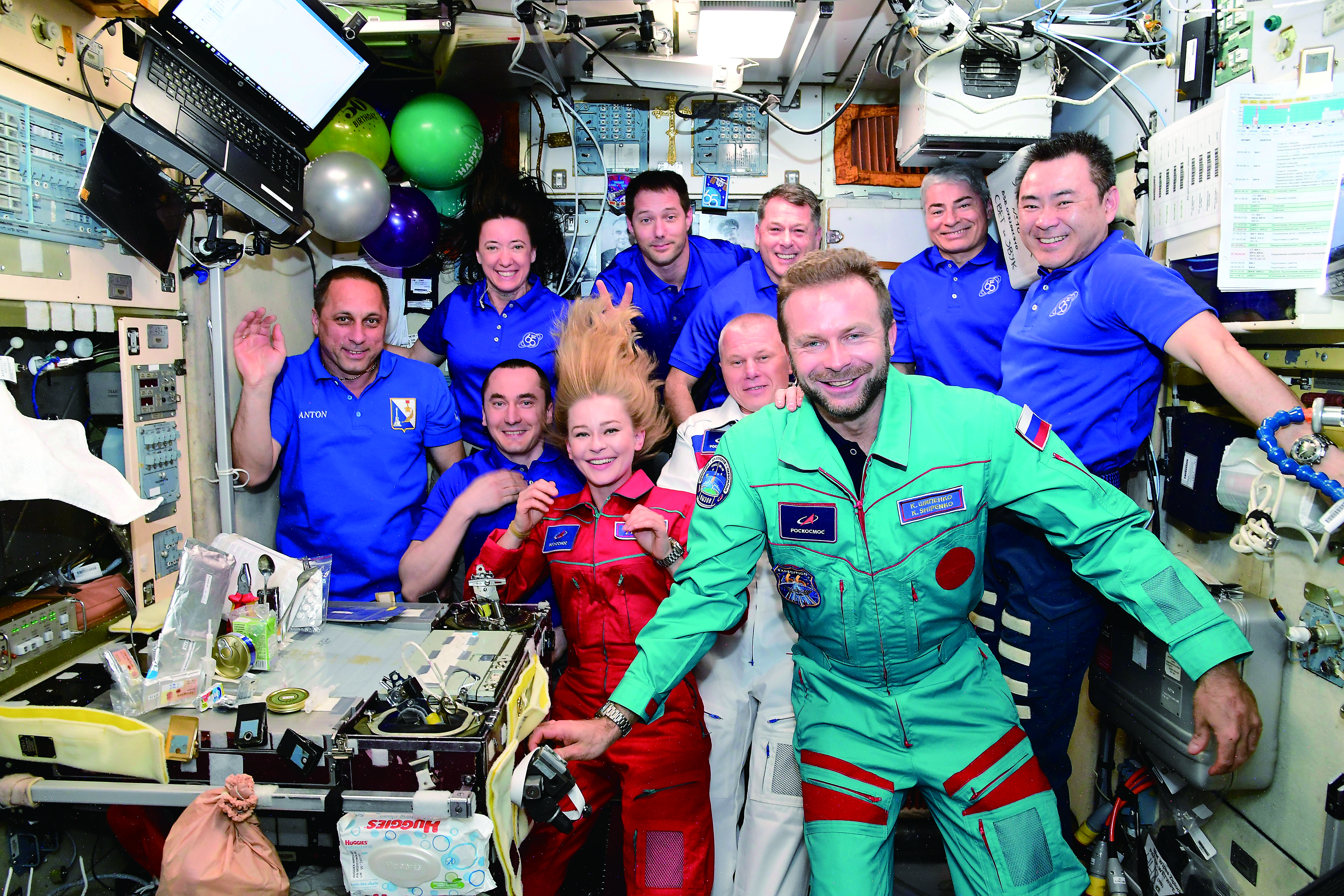 图为女主角尤利娅在国际空间站内与导演克利姆和航天员们合影。在太空失重环境下,尤利娅的头发漂浮着。