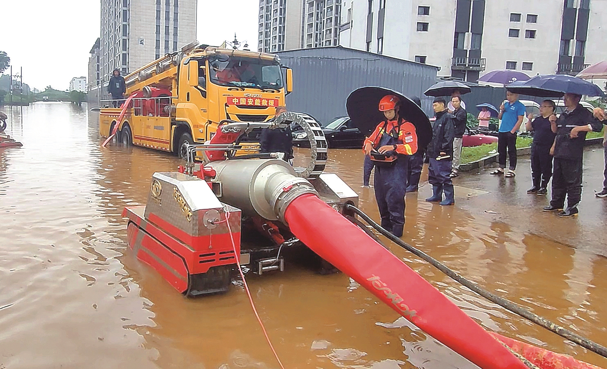 持续不断的强降雨造成多条河流发生超警以上洪水,引发城市内涝、农田被淹等灾情。面对复杂严峻的防汛形势,多地启动防汛应急响应,迅速组成应急抢险队伍,充分利用科技手段做好实时监测、防汛预警和转移避险等防范工作。在贵州省安顺市水文水资源局波玉河水文监测站,水文工作人员使用声学多普勒剖面流速仪测量实时数据,为预防强降水引发山洪灾害提供支持;在安徽省黄山市歙县,消防人员和武警官兵并肩作战,利用排涝机器人——“龙吸水”,以每小时1000立方米的排水量为城市排涝;在浙江省建德市,新安江水库开闸泄洪,与汛情竞速“赛跑”,为上下游防汛救灾争取宝贵的时间。