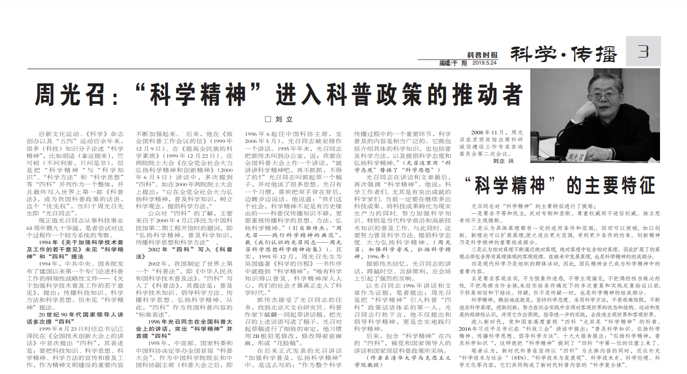 《科普时报》曾发刘立文章《周光召:“科学精神”进入科普政策的推动者》。他当时是清华教授,现为中国科学技术大学马克思主义学院教授