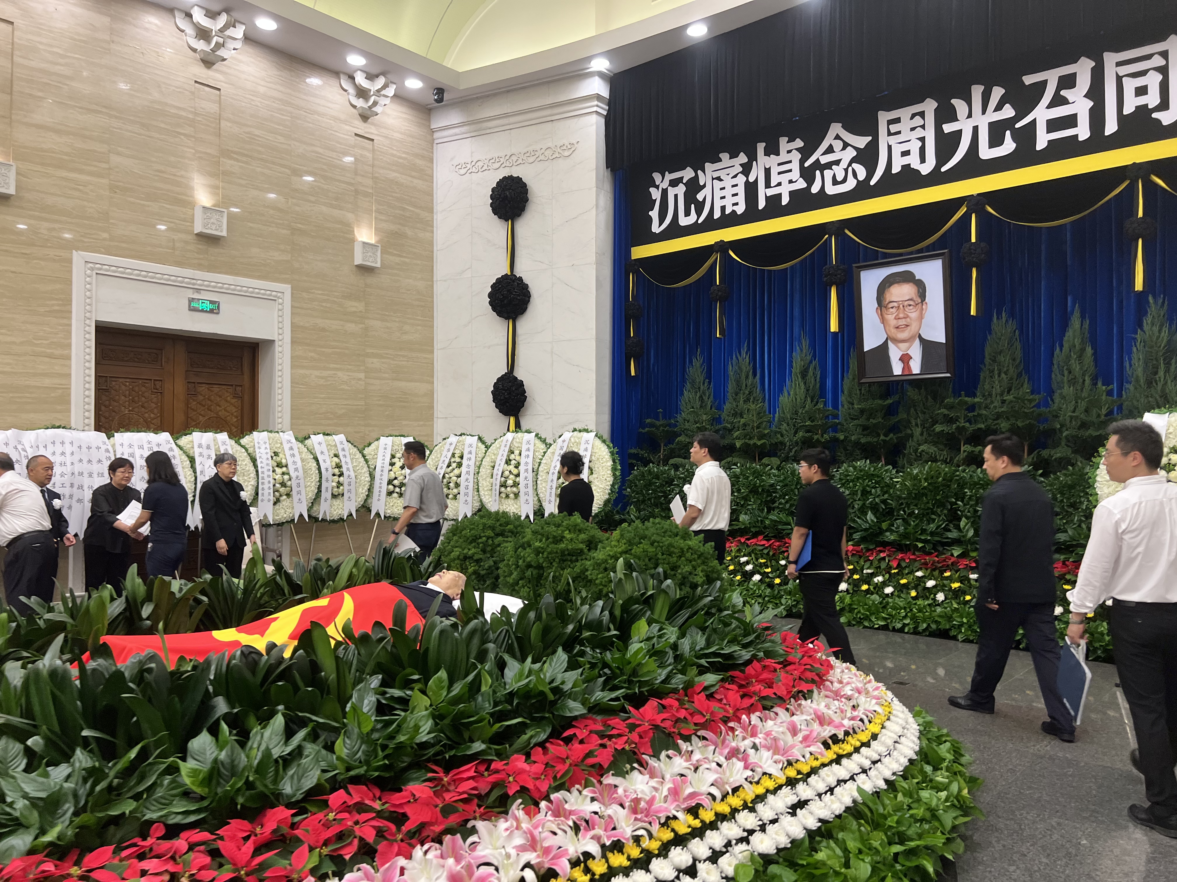 今天,8月23日上午,八宝山革命公墓大礼堂庄严肃穆,哀乐低回。正厅上方悬挂着黑底白字的横幅“沉痛悼念周光召同志”,横幅下方是周光召同志的遗像。周光召同志的遗体安卧在鲜花翠柏丛中,身上覆盖着鲜红的中国共产党党旗。