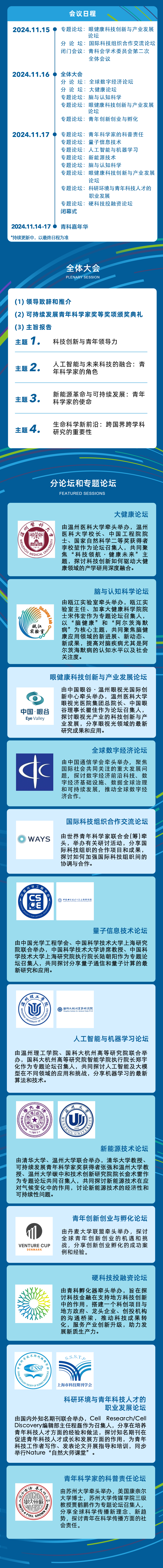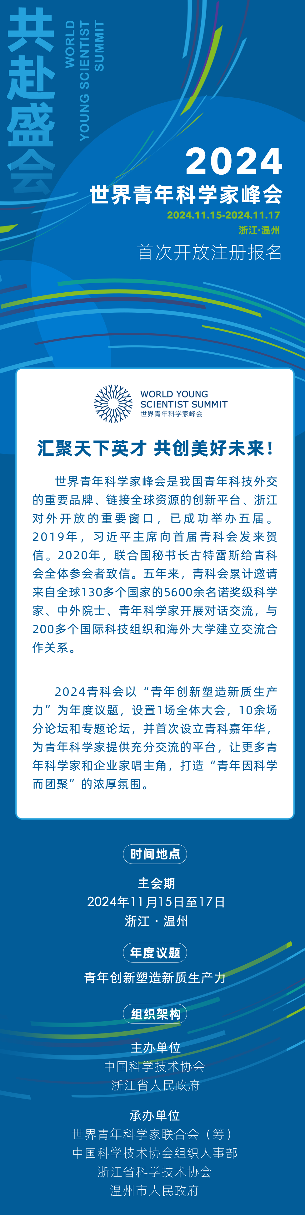 2024年世界青年科学家峰会(以下简称“2024青科会”)将于11月15-17日在浙江省温州市开幕。2024青科会以“青年创新塑造新质生产力”为年度议题,设置1场全体大会,10余场分论坛和专题论坛以及1场青科嘉年华。9月12日,青科会首次开放注册报名,“青科粉”们有机会亲临现场,聆听各领域影响力青年科学家的真知灼见,触摸最前沿的科学技术,对接全球的创新资源。