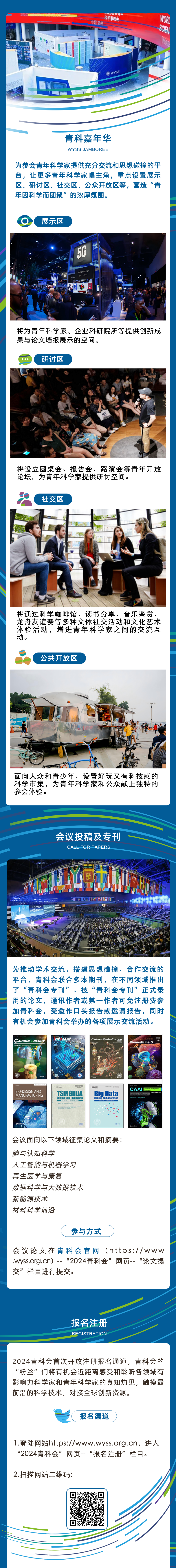本届大会还将首次向多个前沿创新领域征集论文和摘要,并推出“青科会专刊”。通过专刊投稿的论文,可通过快速通道优先审稿,可免注册费参加青科会,受邀作口头报告或邀请报告,同时有机会参加青科会举办的各项展示交流活动。