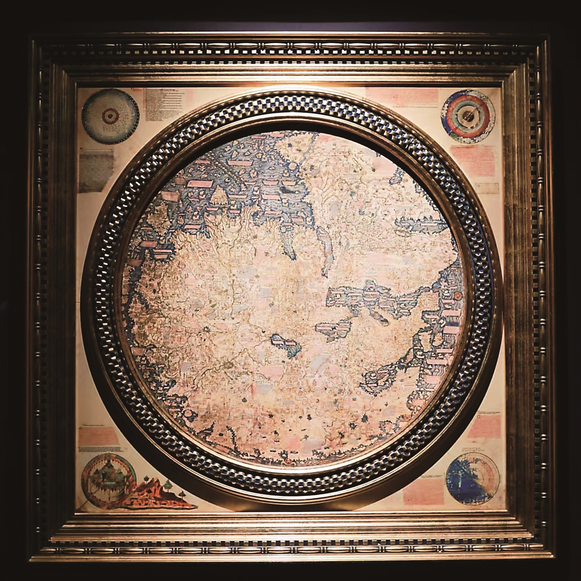 继续向前,记者看到一幅带方框的地图。“这是由卡马尔多利会修士弗拉·毛罗绘制于1460年的《世界地图》,几乎涵盖了当时全部的已知世界,被认为是‘中世纪地图学最伟大的记载’,也被称为‘毛罗地图’。”蒋海梅介绍道,本次展出的是复制品,原作直径约2米,绘制在由木框支撑的羊皮纸上。