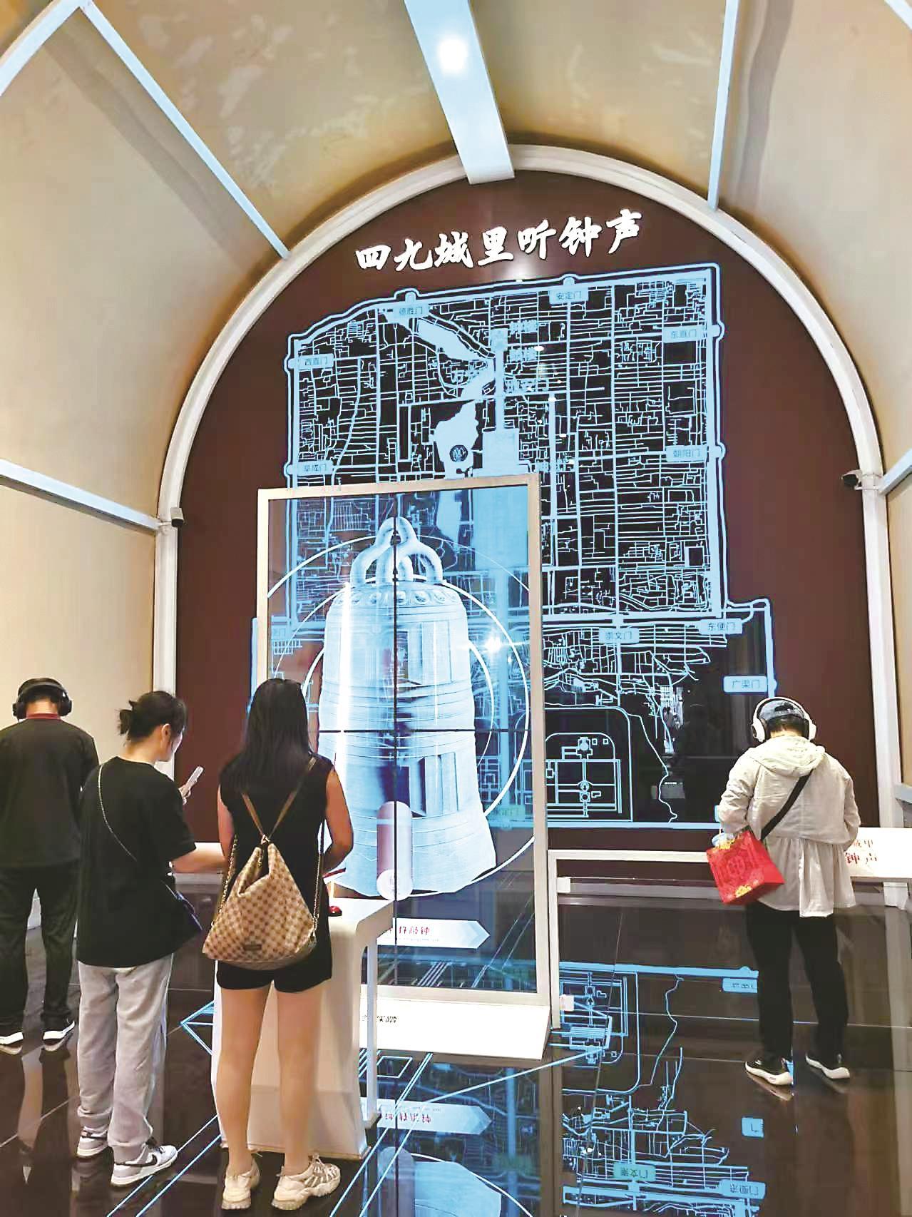 在悬浮于空中的“报时更鼓”和“永乐大钟”前,可以体验虚拟击鼓、撞钟,理解“暮鼓晨钟,鼓为号令,钟为传声”的内在联系;在“四九城里听钟声”展项前,通过选择收听《乾隆京城全图》中不同位置的钟声,感受当年“钟声十里,莫不耸听”的盛况;在触摸屏上点选日晷、铜刻漏、碑漏、时辰香,了解它们的计时原理和精巧构造,读懂箭尺、十二时辰和二十四节气的含义……全国科普日期间,鼓楼以时间为切入口,向公众奉上关于“北京中轴线”的科普盛宴。