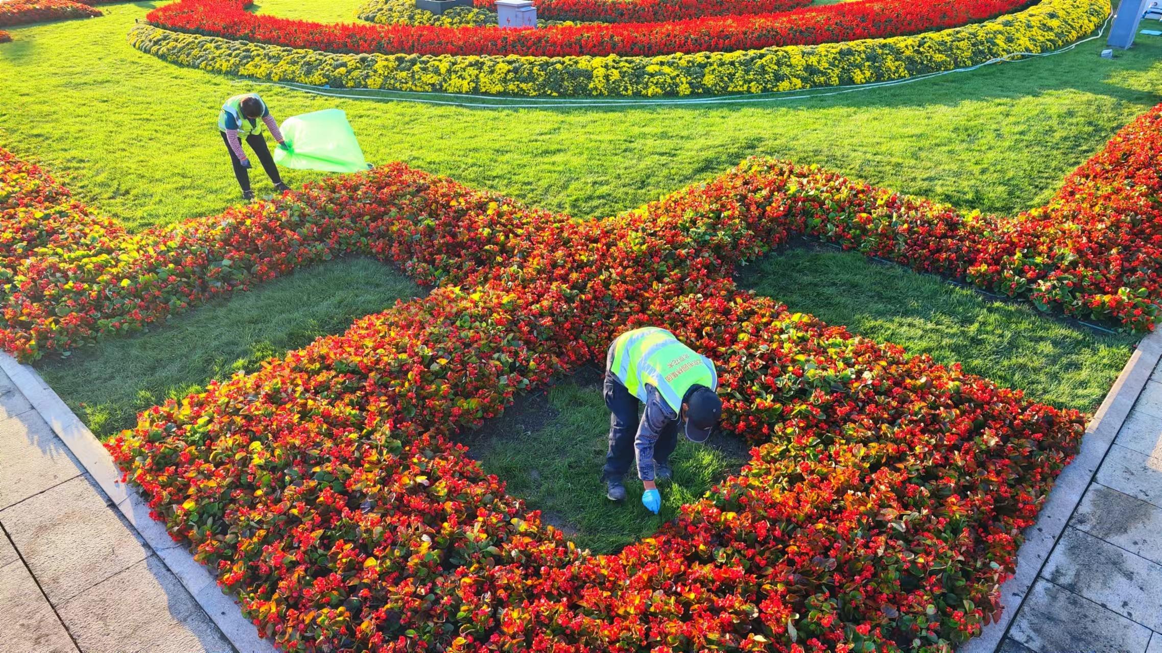9月23日,天安门广场“祝福祖国”巨型花篮已吊装完成,广场装扮一新,东西两侧花坛里海棠花、菊花、串红等花卉竞相开放,花团锦簇盛装迎接国庆75周年。