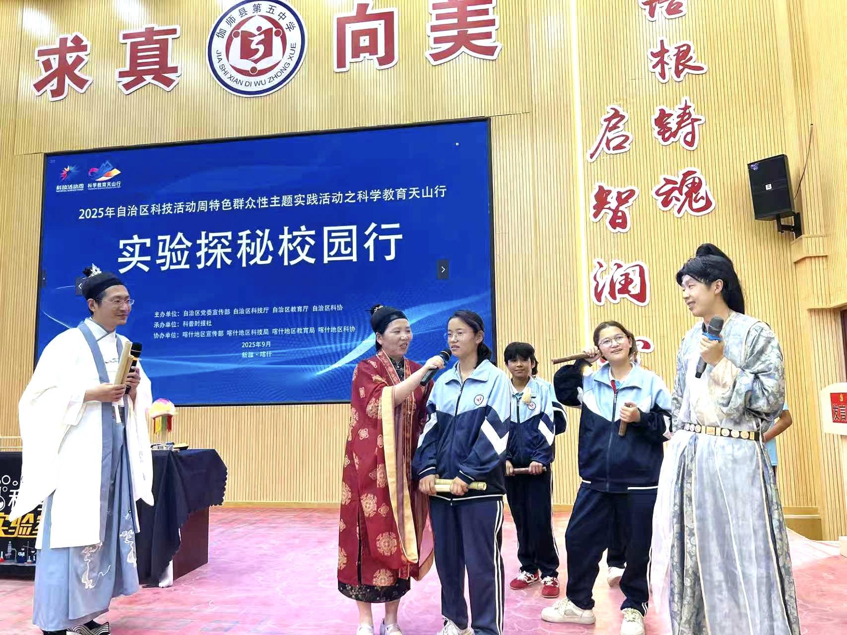 9月16日至17日,“科学教育天山行”之实验探秘校园行活动走进新疆维吾尔自治区喀什市疏勒县东营第二希望小学、疏勒县英尔力克乡中学(齐鲁第三中学)、伽师县巴仁镇第四小学、伽师县巴仁镇第五中学。河南省郑州科学技术馆实验展演团队(以下简称“郑州科技馆团队”)、北京市紫竹院公园管理处实验展演团队(以下简称“紫竹院公园团队”)分别为近2000名学生带来沉浸式科学实验展演——《速影寻真》《季节起始与音乐定音,古人用几根竹竿就搞定了》,这两支团队曾分别在全国科学实验展演汇演活动中获得特等奖与一等奖。
