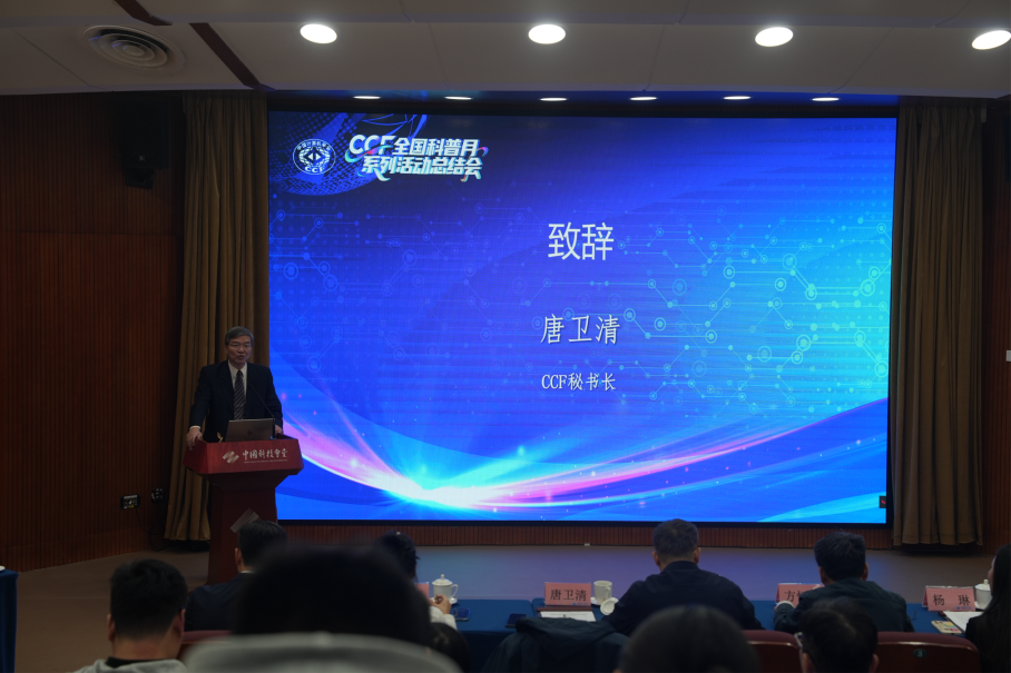 在开场致辞中,CCF秘书长唐卫清回顾了科普月启动以来的各项工作,并对所有参与者和合作单位表示衷心感谢。他指出,为迎接新《科普法》修订后的首个全国科普月,CCF积极响应国家号召,充分发挥自身在计算机领域的专业优势,成功打造了一场覆盖广、参与深、影响力大的全国性科普盛事。