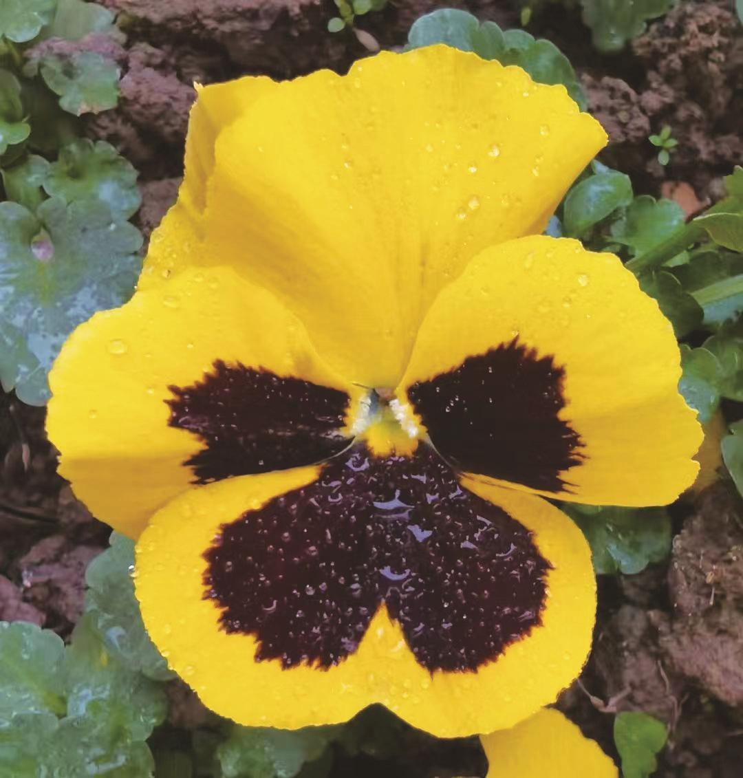 三色堇是堇菜科堇菜属二年或多年生草本植物。其生态策略独特,花朵结构也别具一格。4年前我在重庆拍下一朵带露珠的三色堇(图2),由花面中心可见八字形排列的两簇白毛(图3),此处正是蜜蜂采蜜的入口处。当蜜蜂把长喙插进去时,就会触及柱头上湿漉漉的唇瓣,喙上的花粉便被撸了下来。长喙继续深入,经过长有许多疣毛的区域,新的花粉又被粘上。