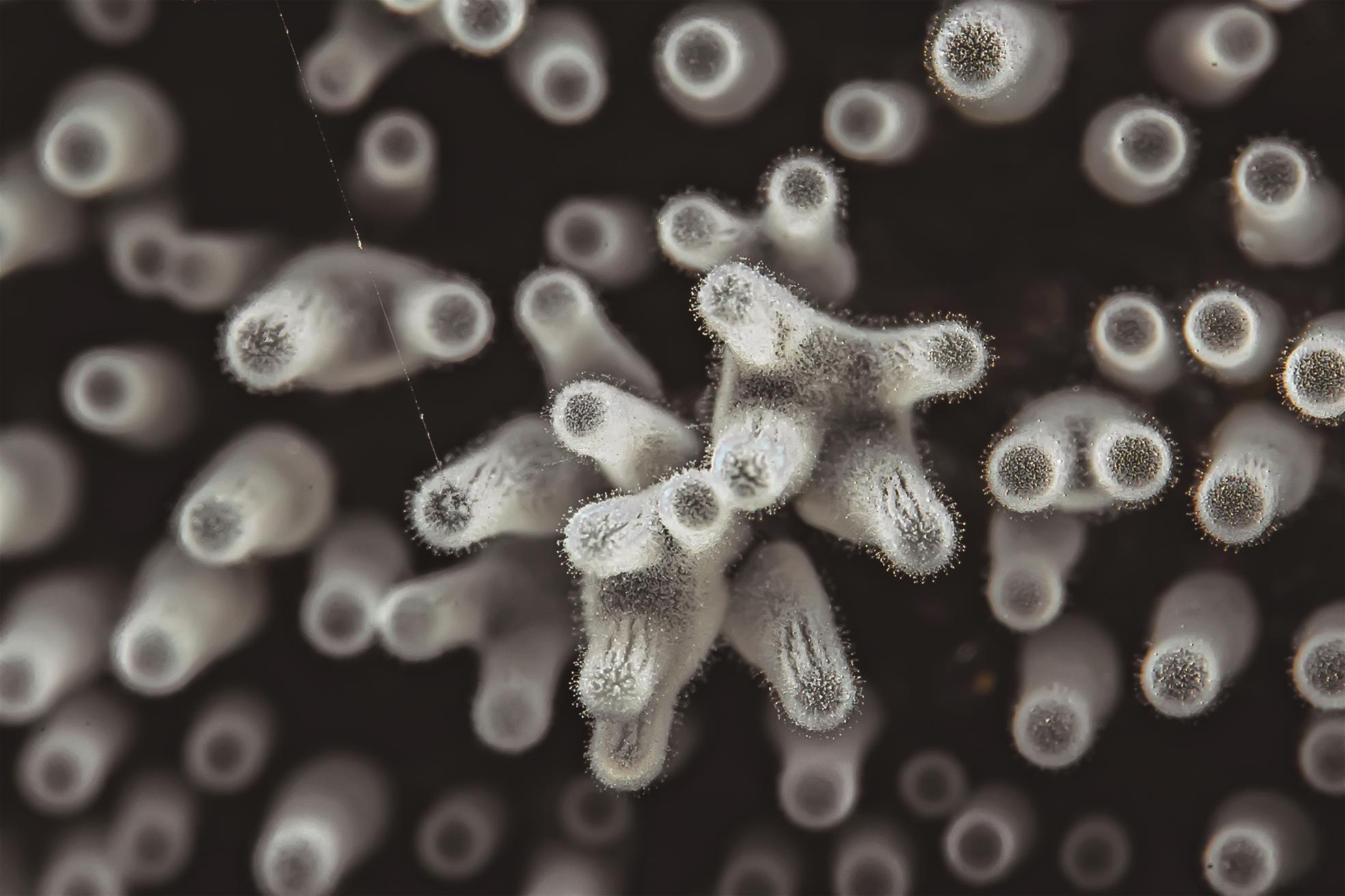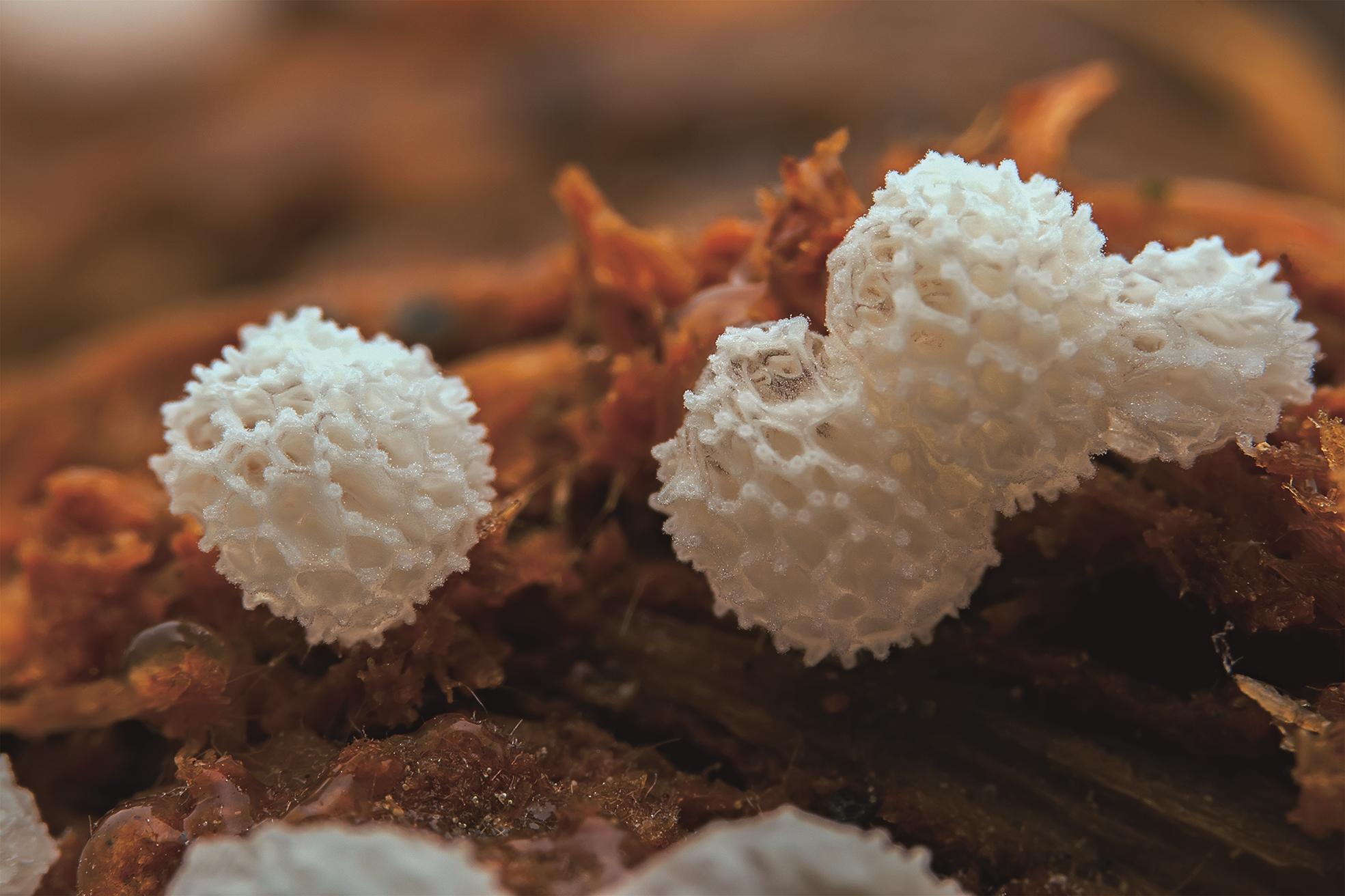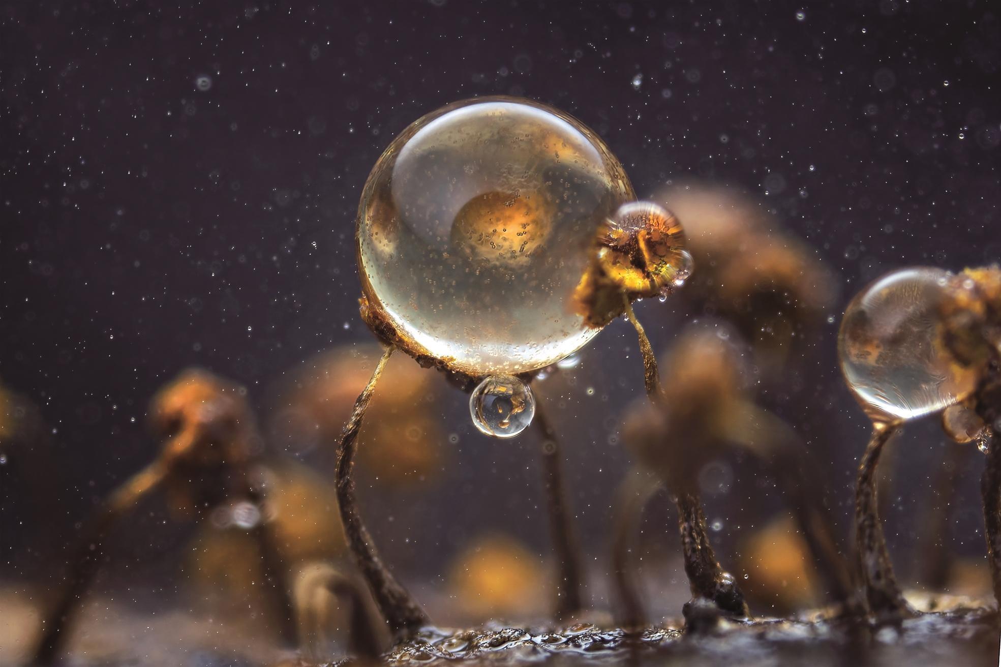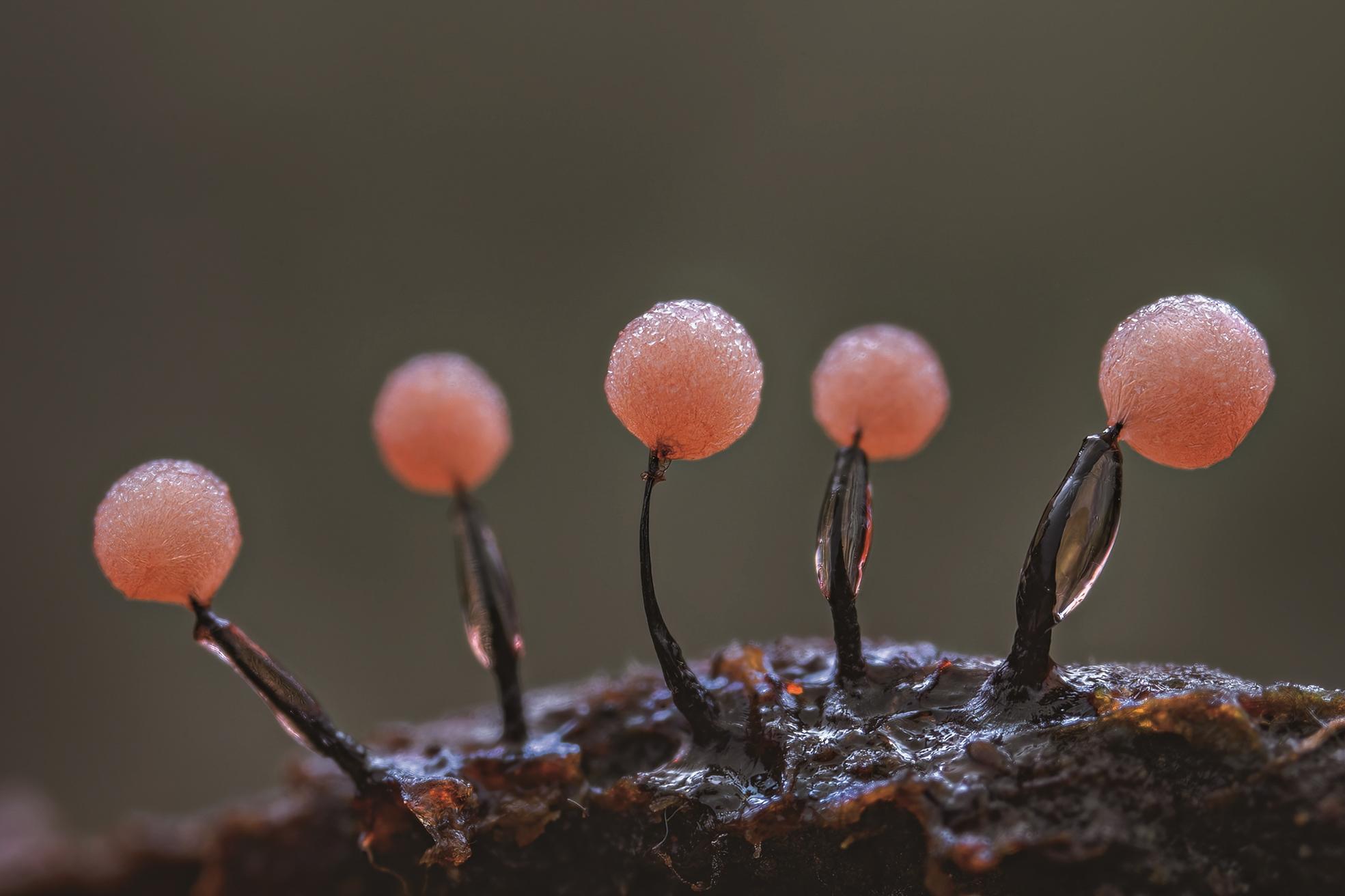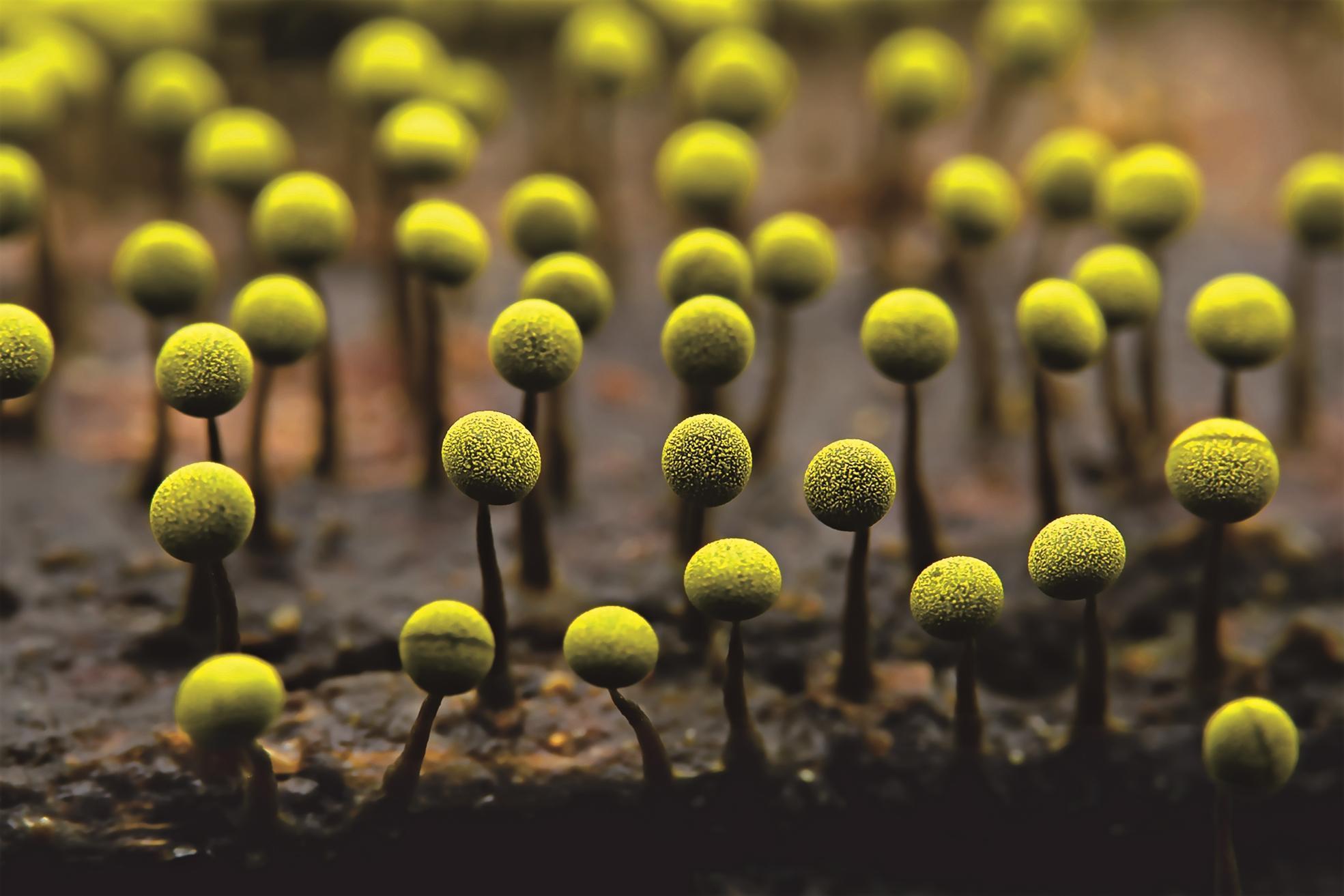 黏菌的世界充满着“魔幻”色彩,平时的黏菌是随性的“黏糊糊”,可到了繁殖期,就会上演惊艳的“变形记”:从一滩软乎乎的黏液里,衍生出细小的菌柱和“小伞盖”等新的生命形态,那是它的子实体,里面装满孢子。当条件成熟,子实体便会瞬间“喷发”出无数孢子,将生命的种子撒向四方。