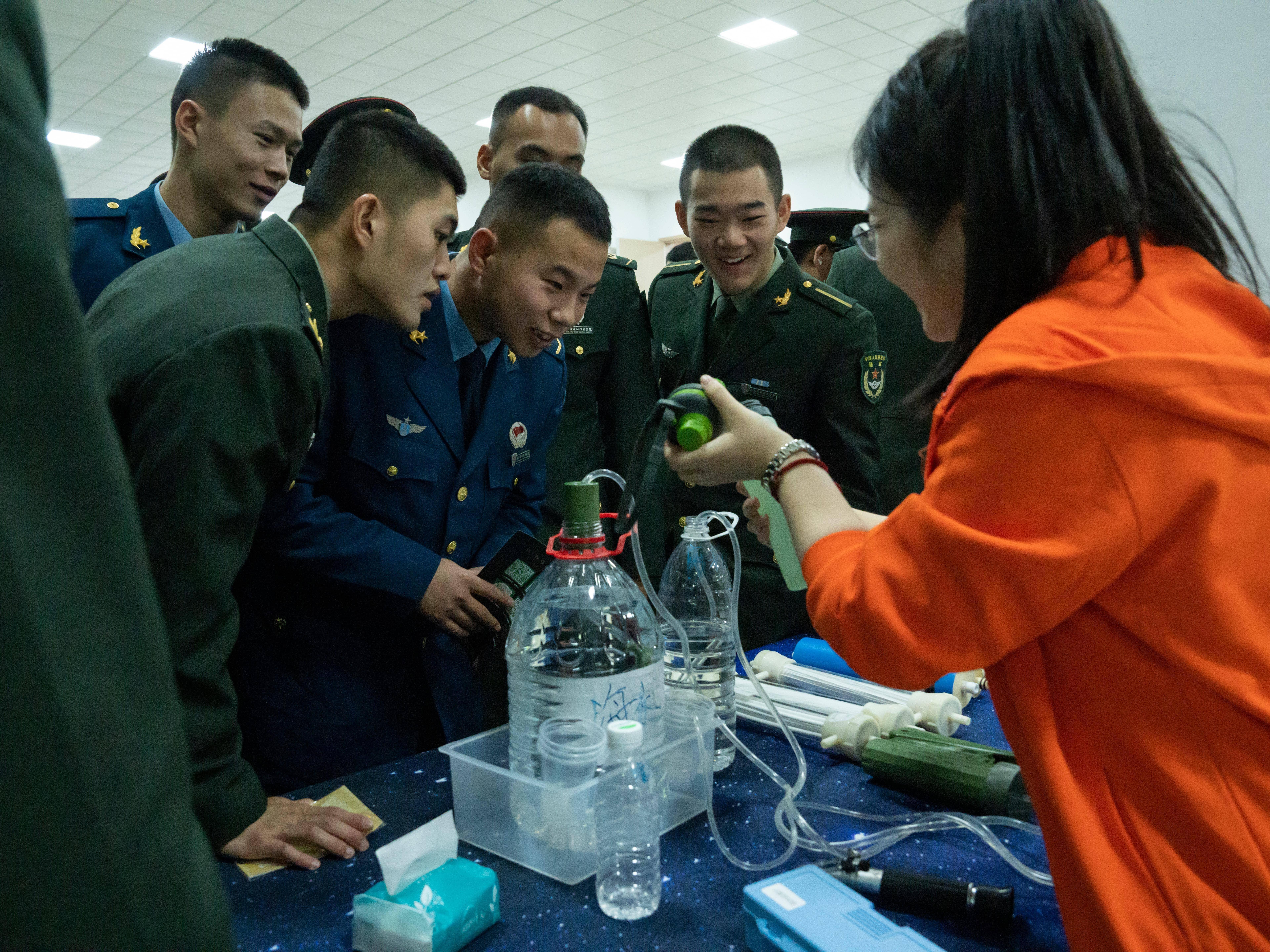 在科普展示区,官兵们参观应急用水装备。中国科技馆供图