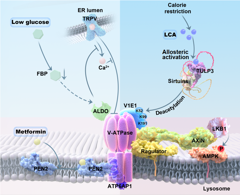 厦门大学生命科学学院林圣彩、张宸崧团队研究发现,卡路里限制后的小鼠血清中数十倍地升高了一种名为石胆酸的成分。石胆酸的投喂能模拟节食效果,在常态饱食的小鼠、线虫、果蝇多种动物中产生促进健康和延缓衰老的作用。该团队还发现了石胆酸的受体,即TULP3,其结合石胆酸之后激活去乙酰化酶Sirtuins,去除质子泵的V1E1亚基上的乙酰基,链接到本实验室发现的溶酶体AMPK通路,并由此起到促健康和抗衰老的作用。该系列研究揭示了人类长期欲寻获的具有延寿的效应分子及其作用机制,为开发能模拟节食效应的干预策略提供了理论基础与新靶点。