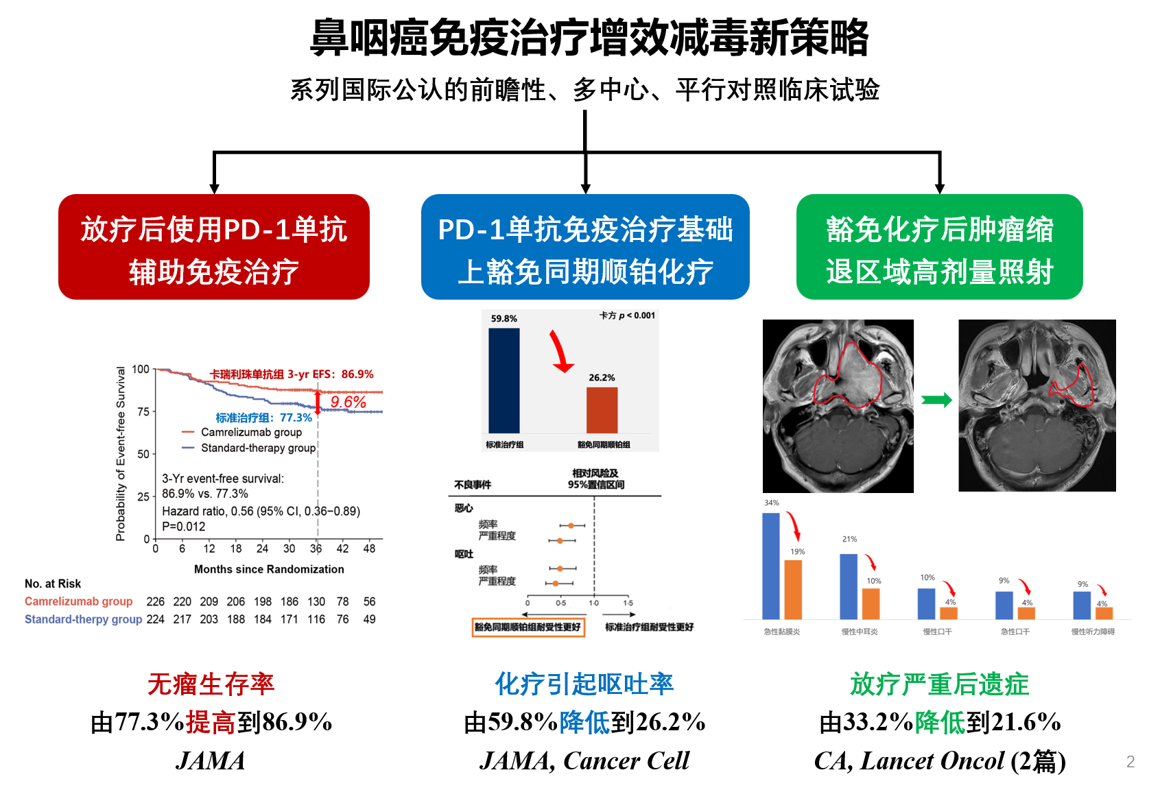 中山大学肿瘤防治中心孙颖、马骏团队通过一系列国际公认的前瞻性、多中心、平行对照临床试验,在鼻咽癌增效方面,证实放疗后使用PD-1单抗辅助免疫治疗,可将失败风险降低了44%,生存率由77.3%提高到86.9%;在减毒方面,研制出在PD-1单抗免疫治疗基础上豁免同期顺铂化疗,不降低疗效的同时,将化疗引起呕吐率由59.8%降低到26.2%;并制定了“豁免化疗后肿瘤缩退区域高剂量照射”,使放疗严重后遗症由33.2%降低到21.6%。由此,创立了鼻咽癌免疫治疗“增效减毒”新策略。