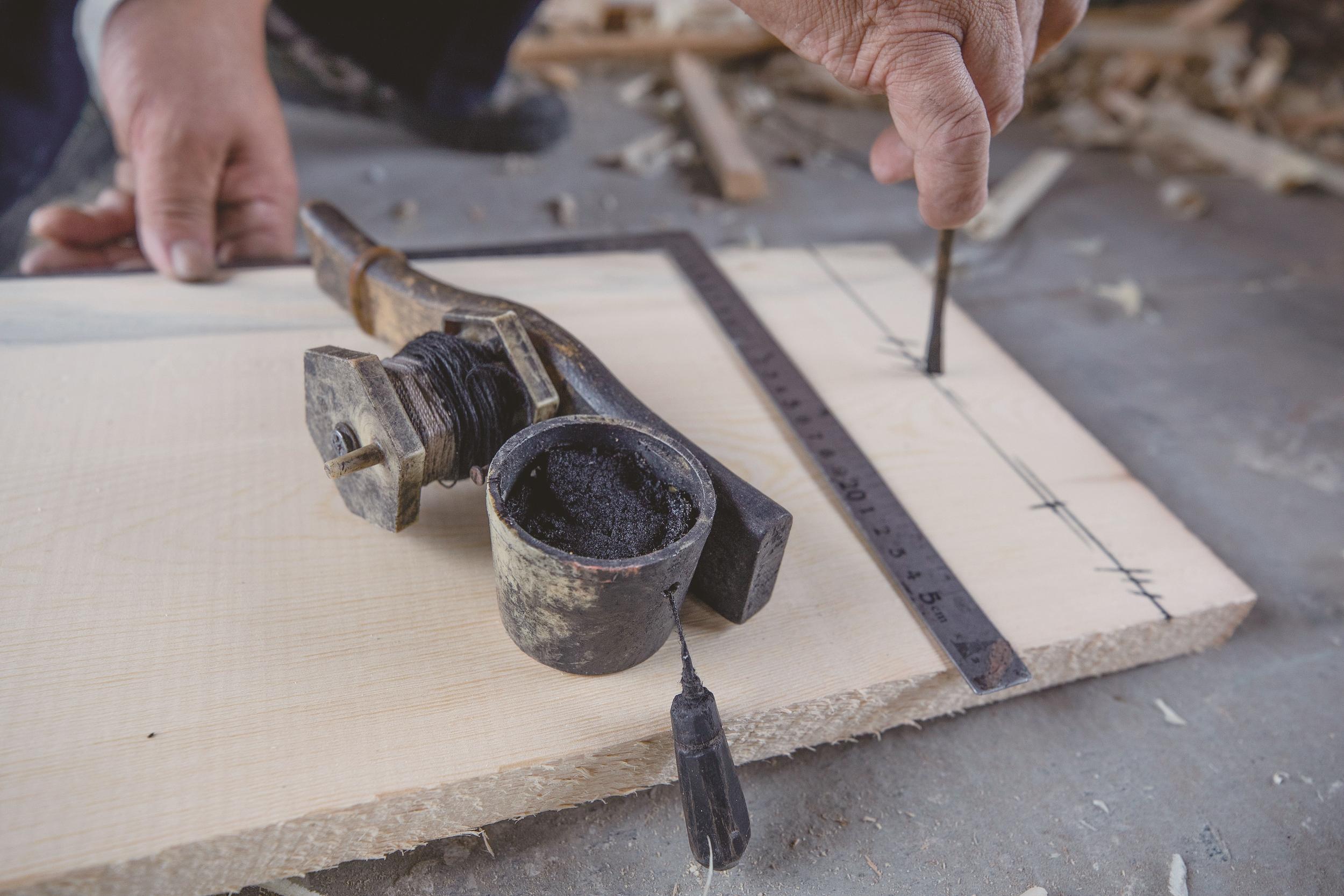 使用墨斗时,在需要锯的木材两端各画一个点,一人将墨斗固定在起点,为使墨线浸墨饱满,一人可用墨签压着墨线,往外拉至终点勾住线锥,确保线笔直、紧绷,用手指在线中间处垂直上拉,再松手弹回,木材上印出墨线。画完线后,转动线轮手柄,收回墨线,小蛇一样盘在线轮上。