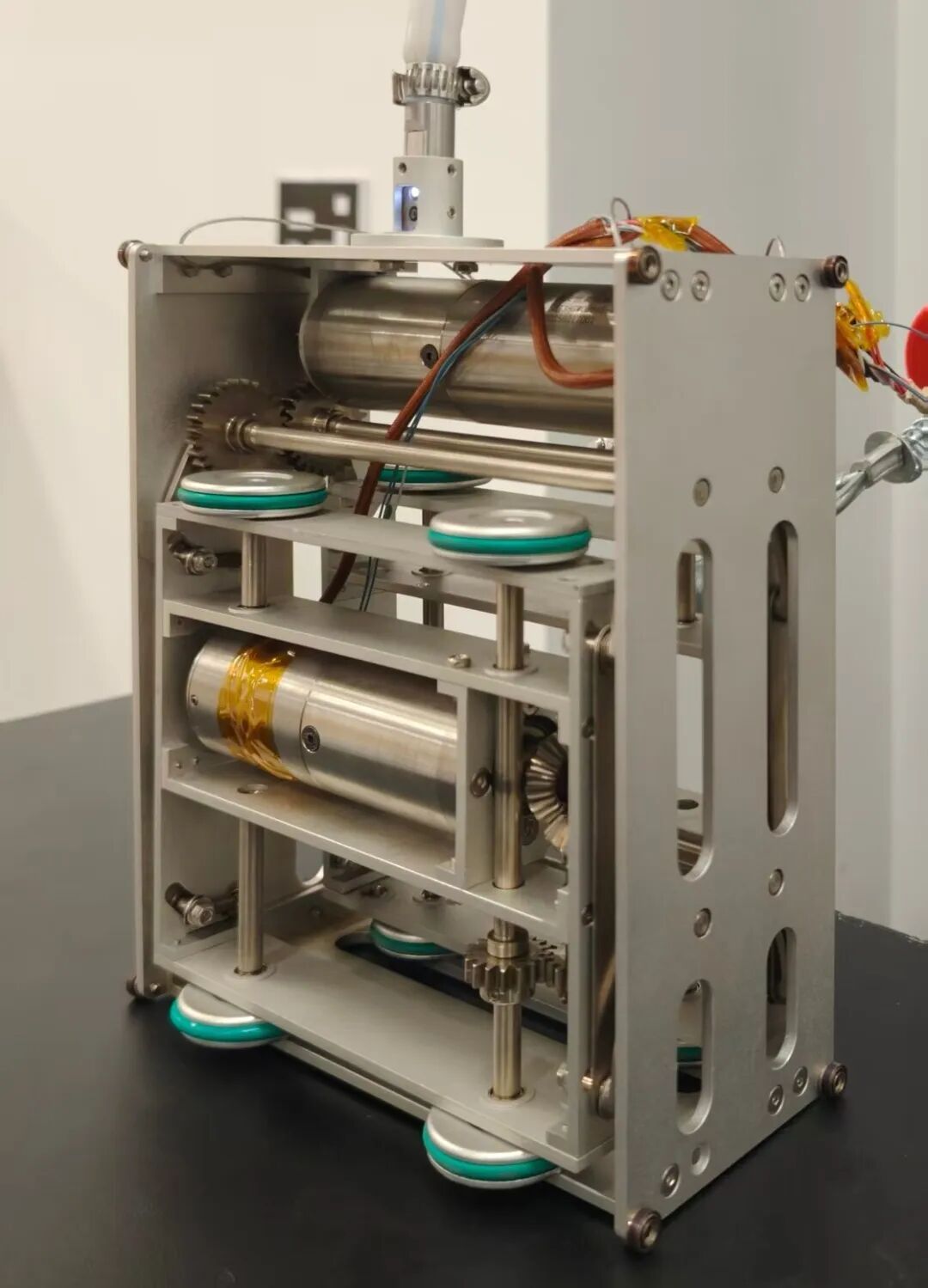 该装备采用可重构设计,能轻松通过检测入口,按需拓展宽度,使行走轮与容器壁面紧密贴合,机身四角加装了轴承轮,覆盖“上升下放、左右横移”等运动方向,在贴合容器壁面的同时可横向移动,实现容器环形焊缝的检测,并顺利通过底部直角弯等复杂区域。同时,针对反应堆辐射环境特点,该装备还采用了多层级加固技术,有效保障摄像头、电机驱动等核心电子器件的稳定运行。相比传统人工检测方式,双层容器无损检测智能装备可大幅提高作业效率,降低人力成本与安全风险,紧急突发情况下也可快速部署系统并完成现场评估,及时提供技术支持。