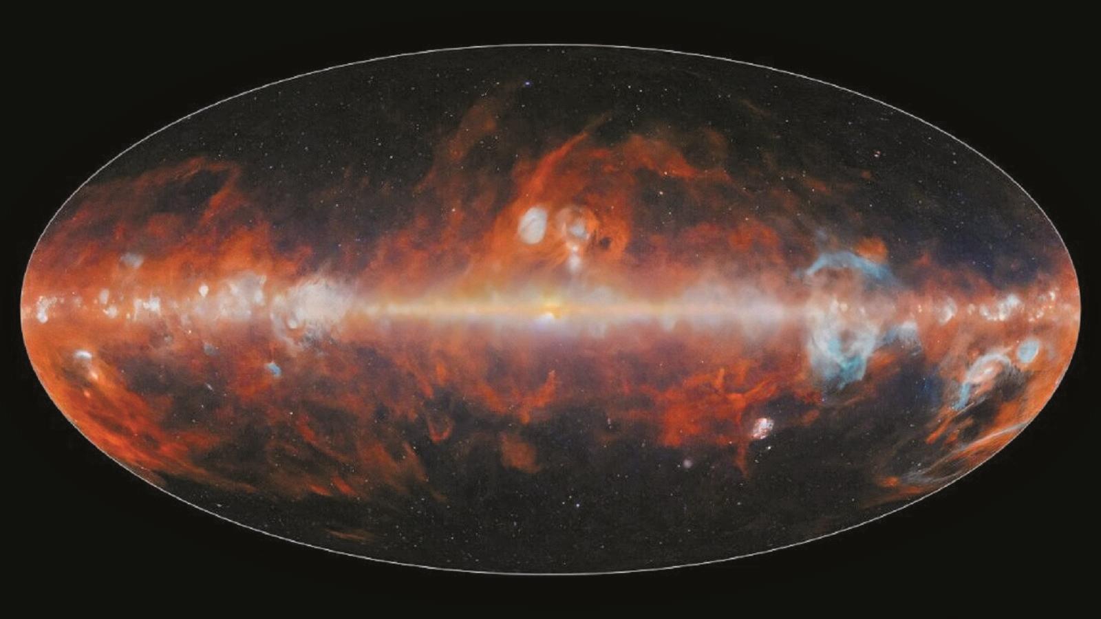 今年5月,科学家启动了全天空测绘。仅仅过了6个月,SPHEREx就完成了这幅覆盖整个天空的102色红外图谱。