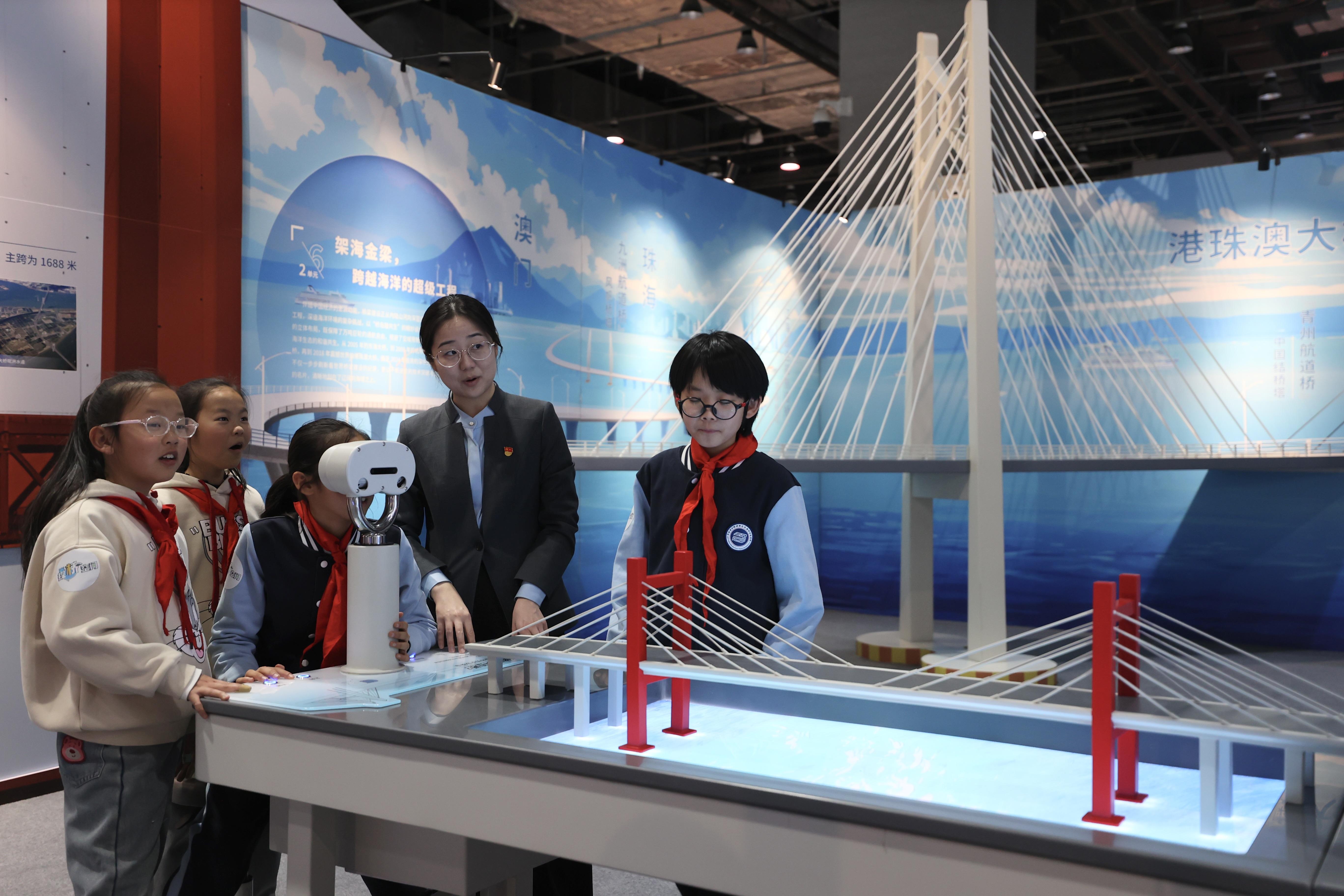 中国古今桥梁科技文化展系统呈现了中国桥梁从古代到近代、再到现代的发展脉络与辉煌成就。展览展出互动展品38件(套),借展珍贵实物12件(套),注重为观众打造沉浸式、多维度的观展体验。观众可以亲手搭建桥梁模型,借助MR眼镜、镜面屏等配套设备,直观了解桥梁基础知识;通过架桥机模拟体验,或操作造塔机模型、起重船模型,解码大国重器的奥秘……此外,“自己拉自己”等趣味互动装置,将科学原理融入轻松游戏,让观众在互动中领悟桥梁建造设备背后的科学内涵。