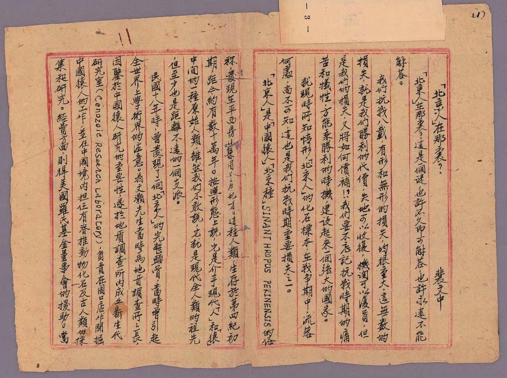 “‘北京人’的化石标本,在战争中流落何处,尚不可知,这是抗战时期的重大损失之一。”这段沉痛且深情的文字,出自“北京人”化石发现者裴文中先生的珍贵手稿。
