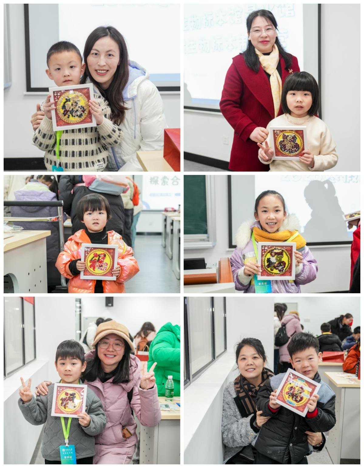 在动手环节,孩子们在大学生志愿者的指导下,体验了“种子贴画——五谷贴福字”。借助各式各样的谷物种子,他们精心拼贴出寓意吉祥的“福”字作品,在实践中认识种子的多样性,也感受了自然材料与传统文化相结合的艺术乐趣。